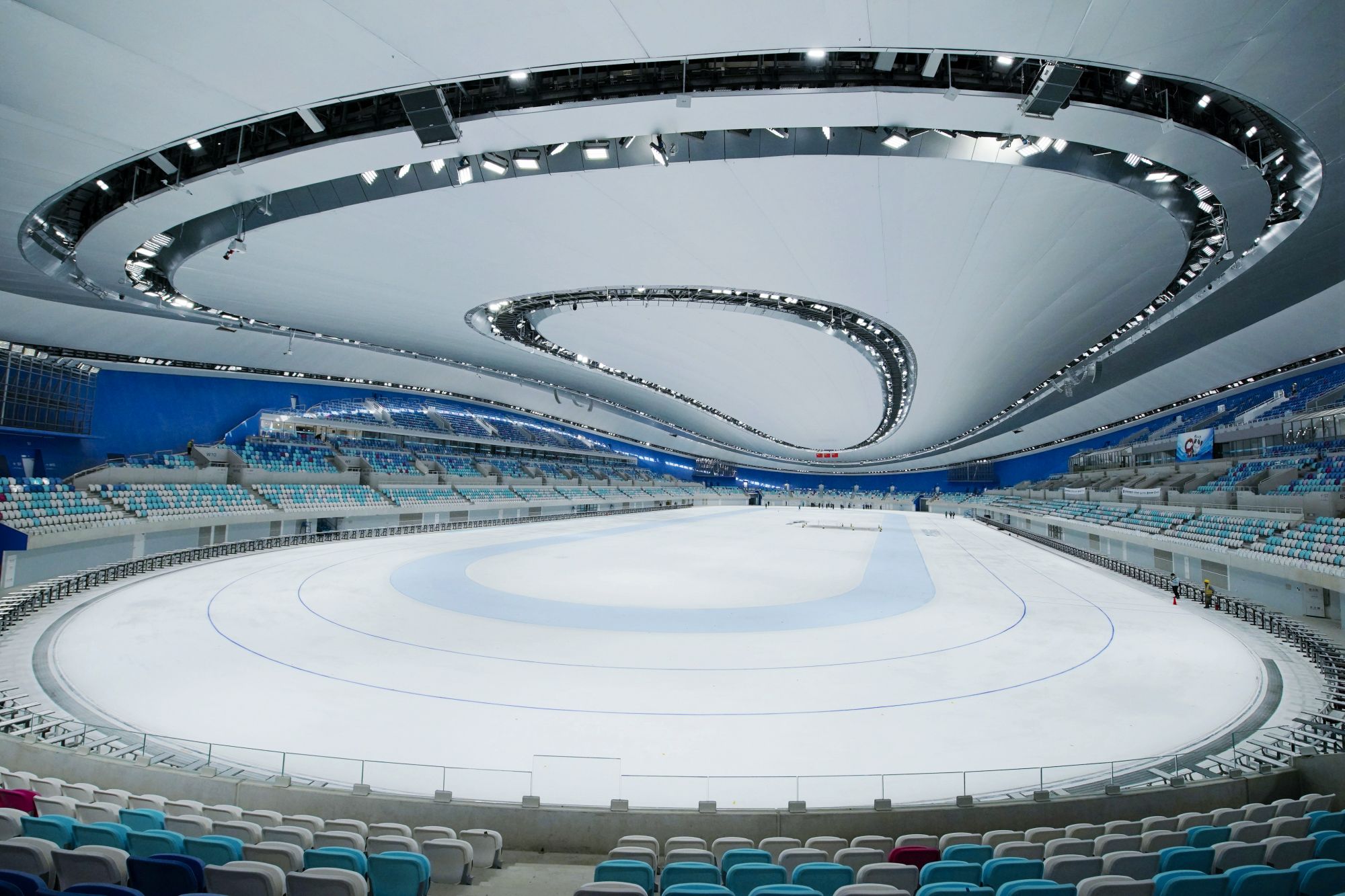 这是2021年5月8日拍摄的“冰丝带”国家速滑馆冰面。国家速滑馆1.2万平方米的冰面是二氧化碳制成的“最环保的冰”,在绿色、环保、可持续方面为奥运会树立新标杆。