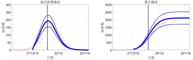 西安疫情发生以来,预测组跟进西安市疫情防控动态,在新冠肺炎疫情全球预测系统中综合考虑了当地城市特征、气象条件和管控措施等影响因素。系统的更新预测结果显示,在当前政府采取的及时、有效的管控措施下,西安市本轮疫情预计将于2022年1月15日左右得到控制,累计确诊病例数预计约2115人(1703—2526人)。