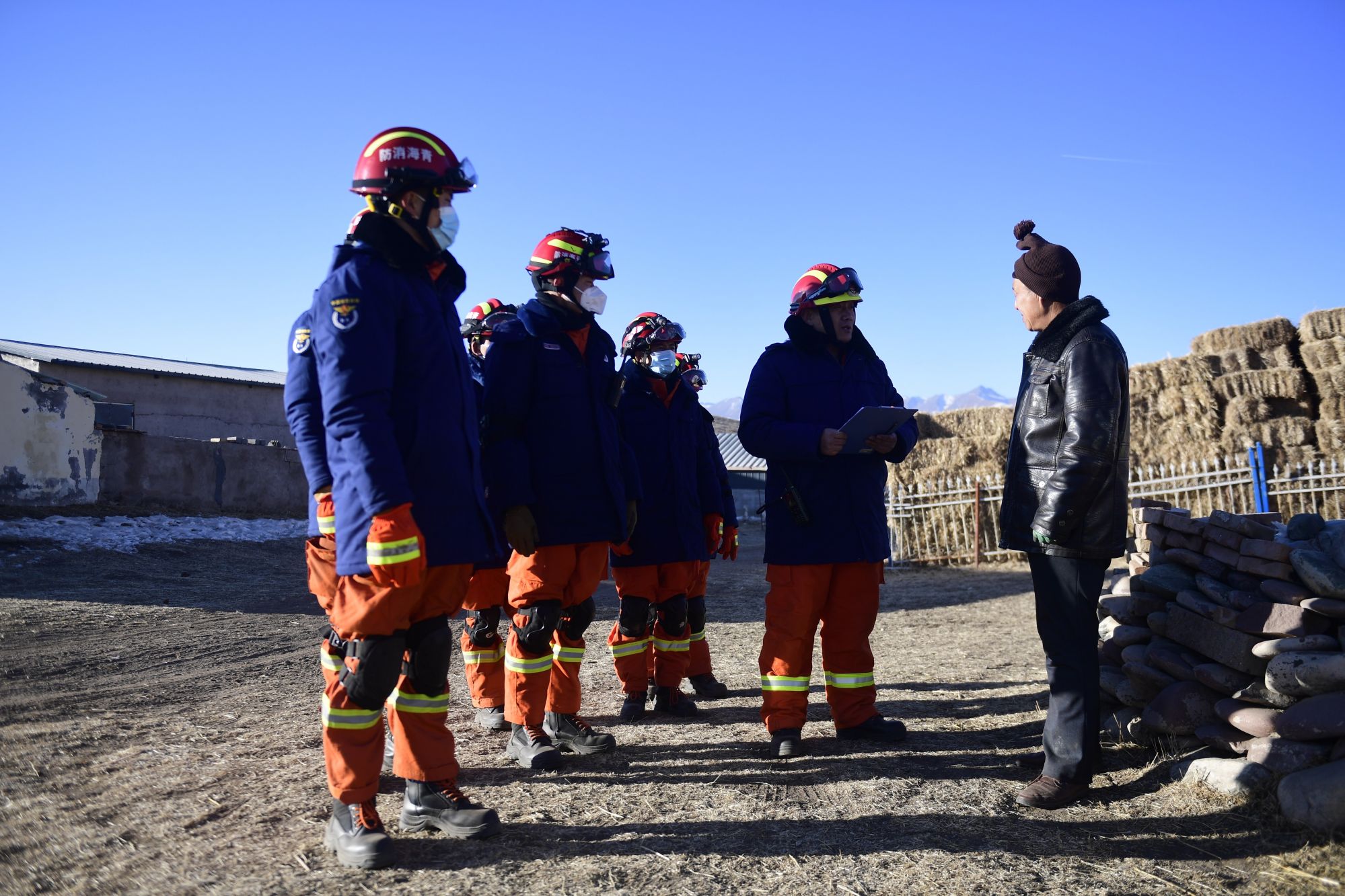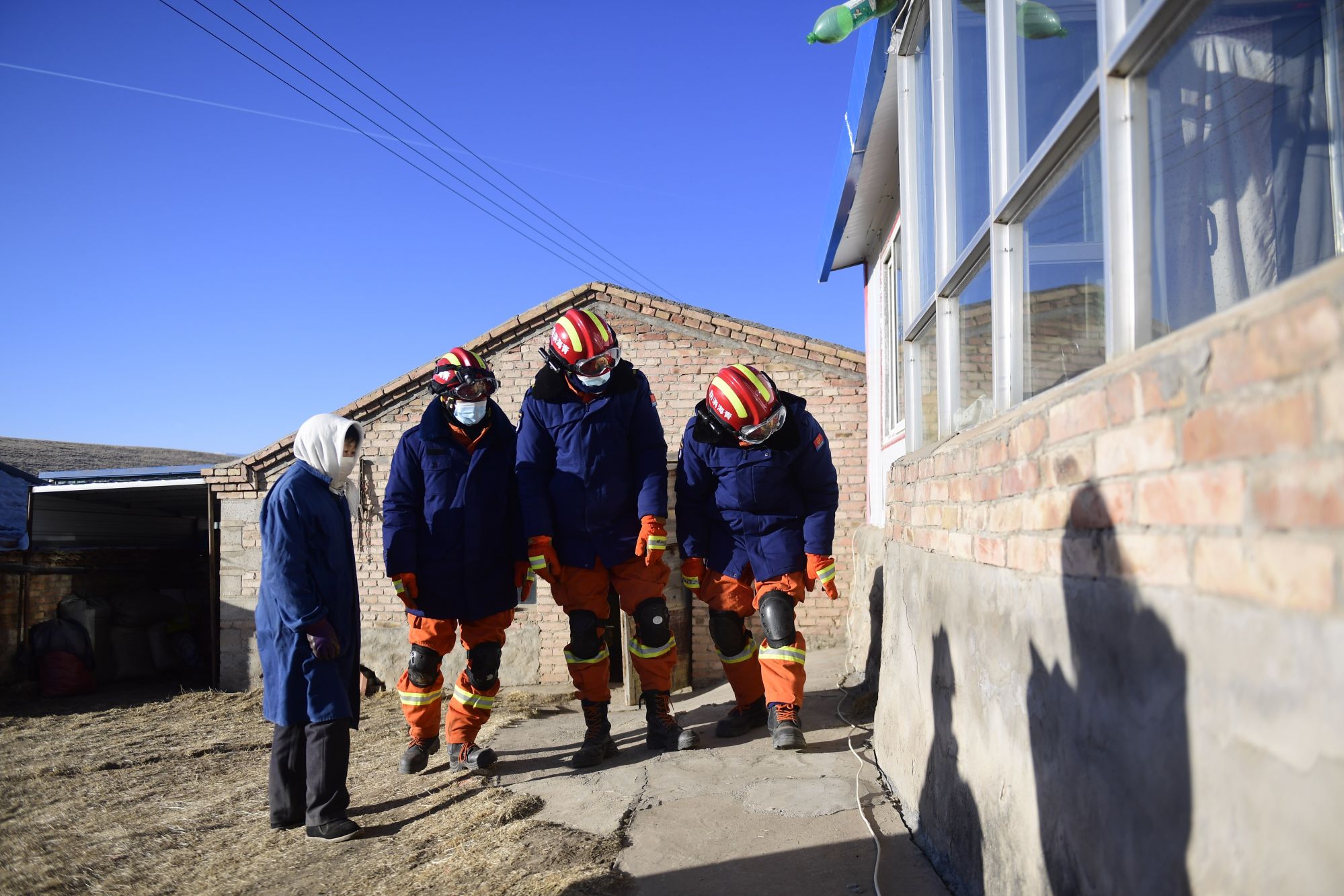 1月8日,在青海省海北藏族自治州门源回族自治县皇城蒙古族乡马营村,海北州消防救援支队队员在入户排查。新华社记者 张龙 摄
