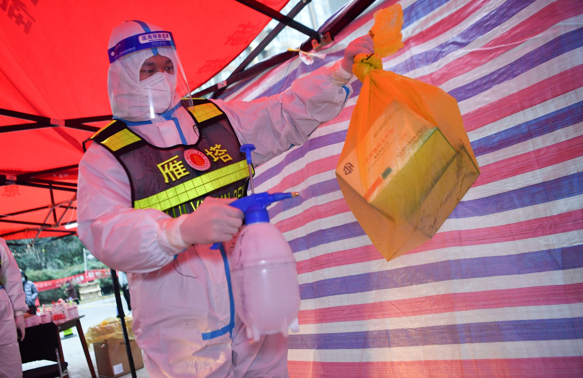 ↑1月7日,西安市雁塔区退役军人志愿突击队队员桑海鑫为核酸检测样本外包装消毒。