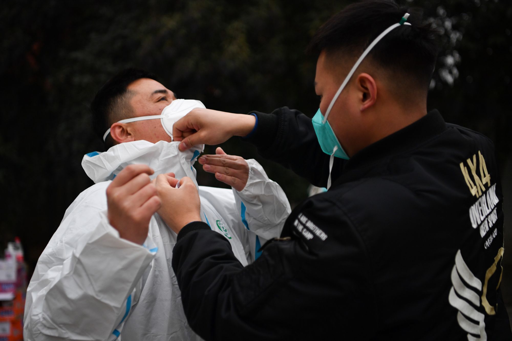 ↑1月7日,西安市雁塔区退役军人志愿突击队队员李龙(右)协助队员吉存胜穿上防护服。