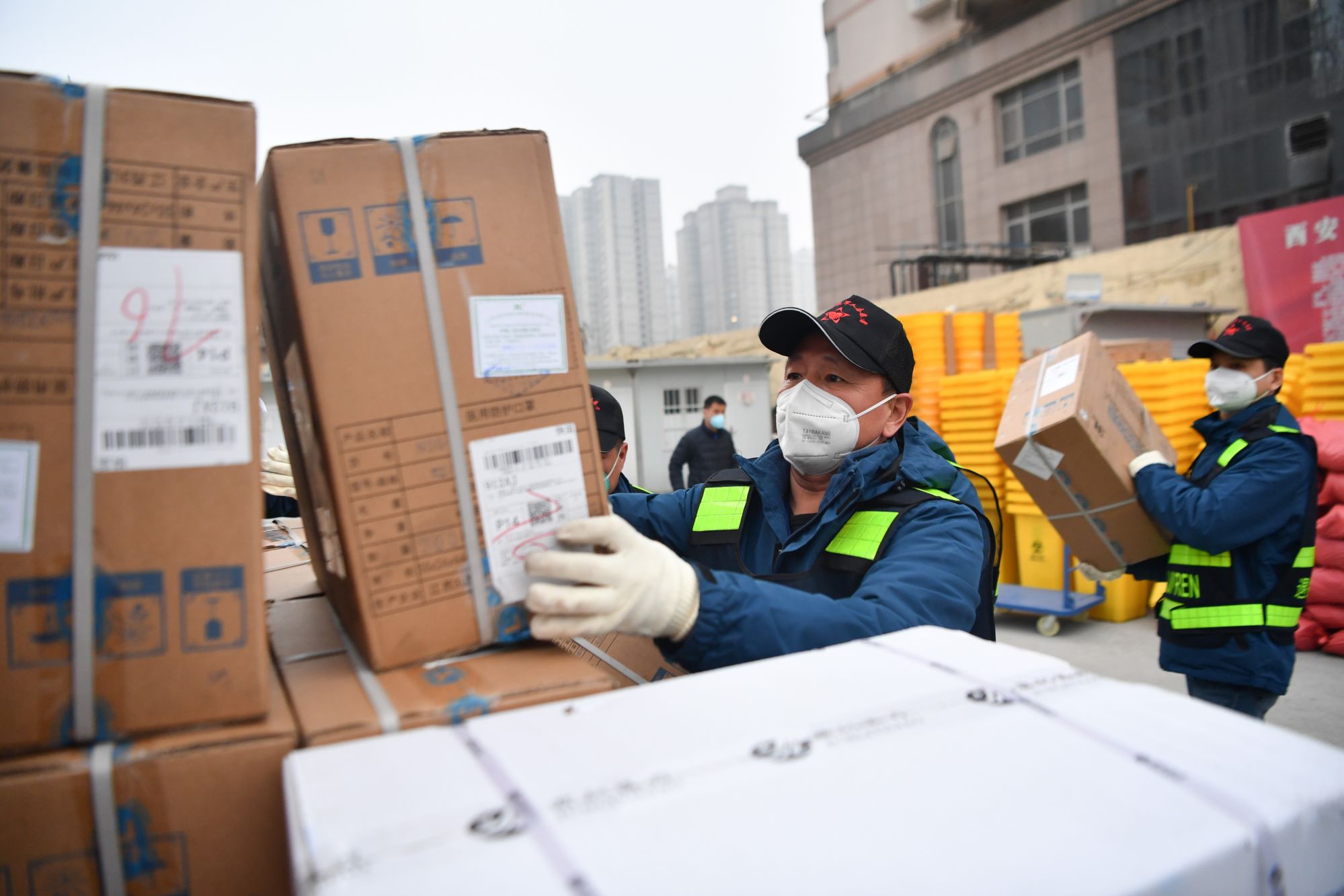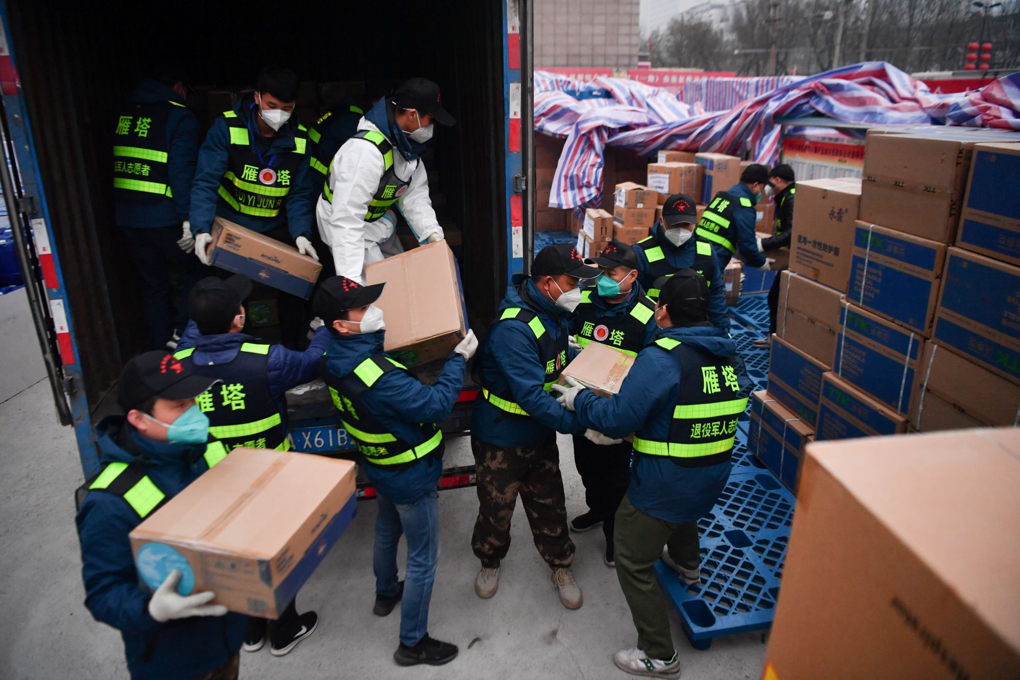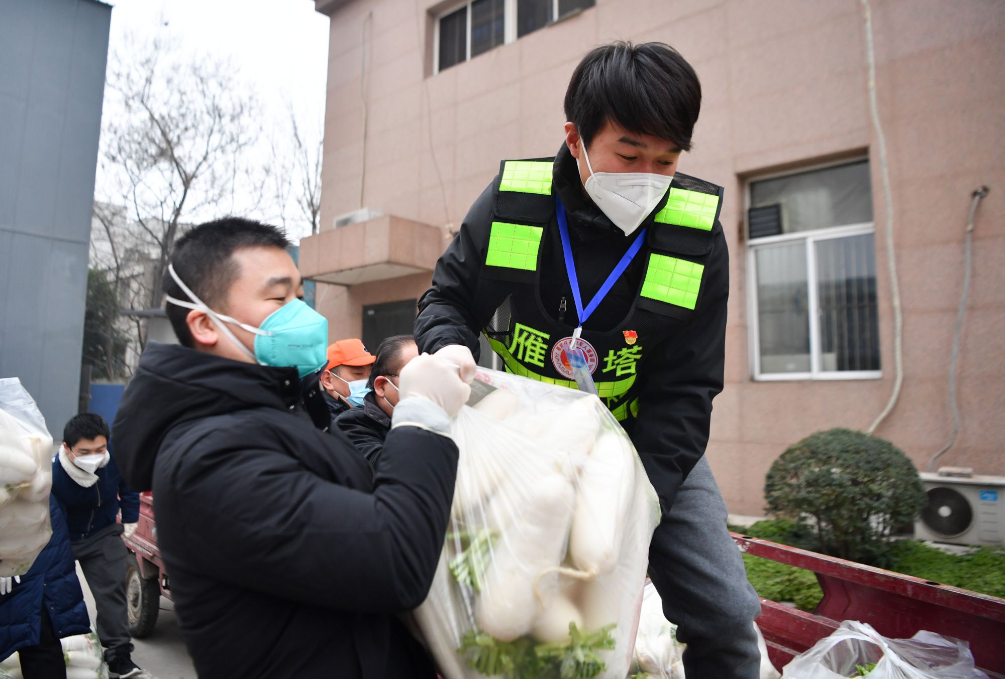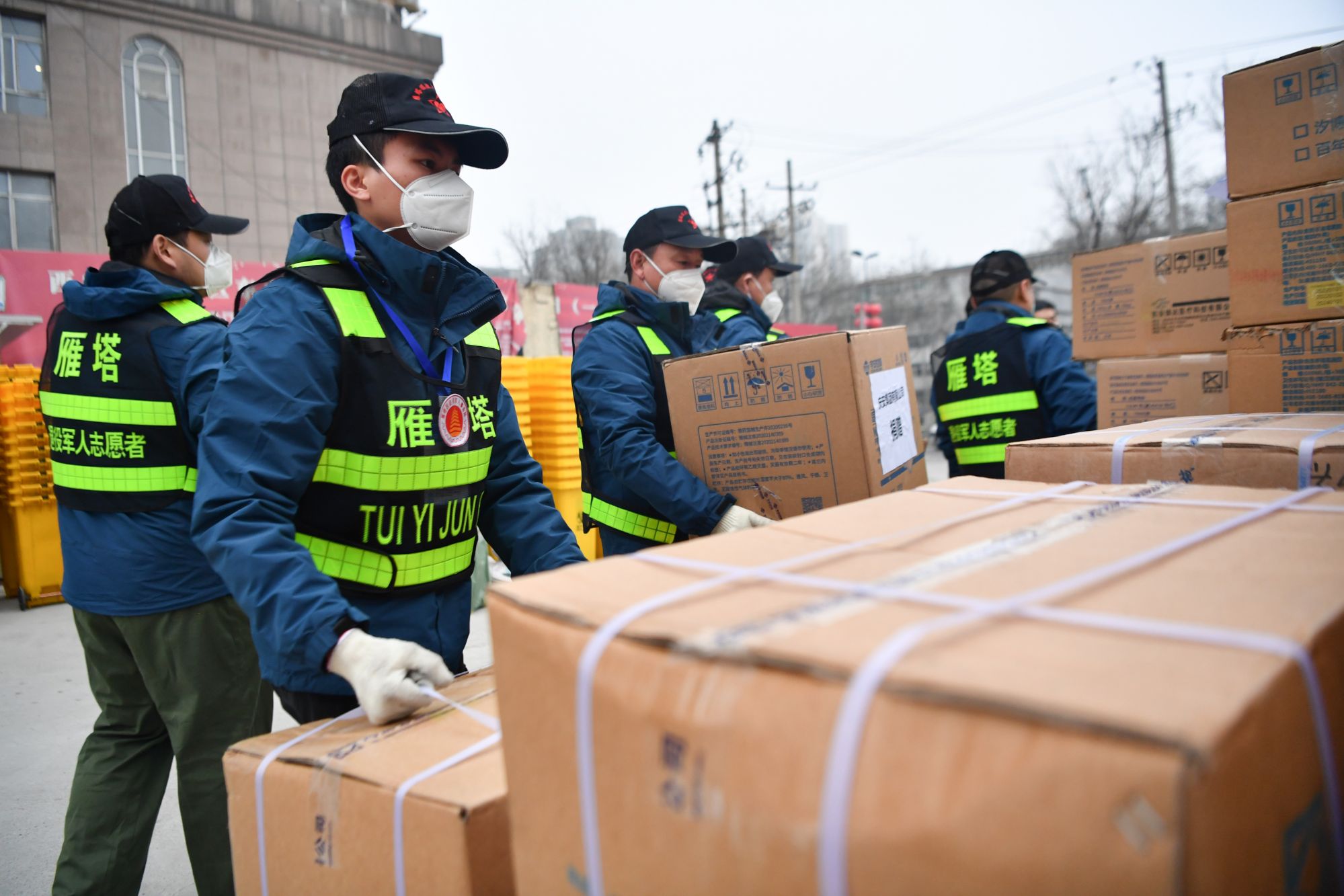 ↑1月6日,西安市雁塔区退役军人志愿突击队队员搬运防疫物资。