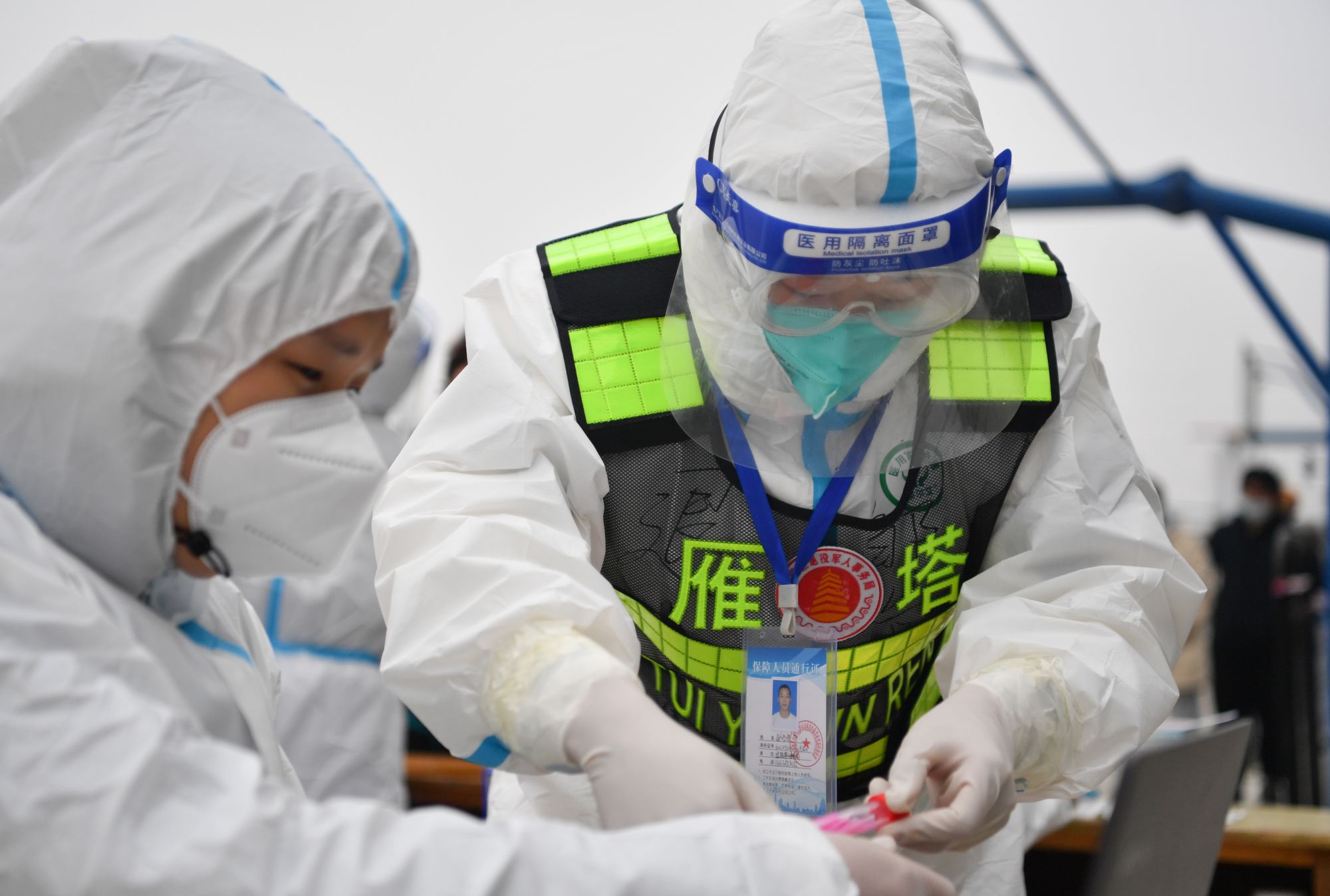 ↑1月7日,西安市雁塔区退役军人志愿突击队队员邹浩东(右)在一处核酸检测点与工作人员交接核酸检测样本。