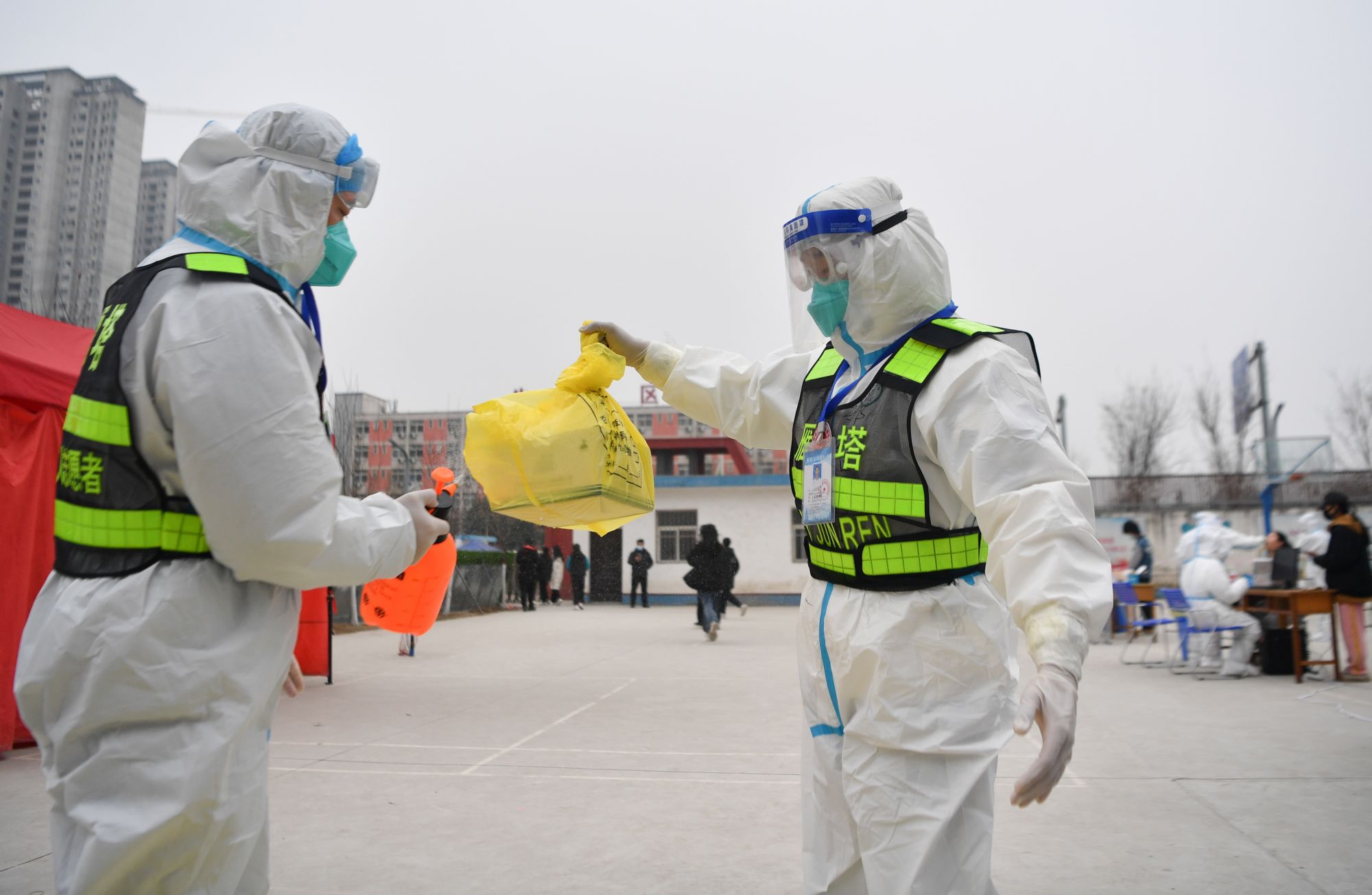 ↑1月7日,西安市雁塔区退役军人志愿突击队队员在一处核酸检测点互相协助为防护服消毒。