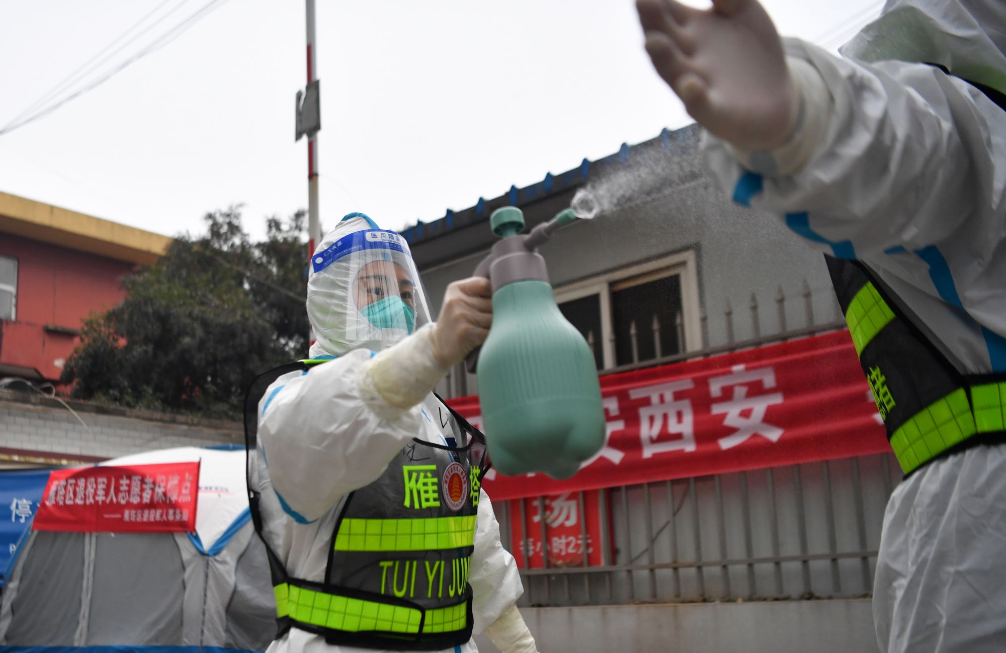 ↑1月7日,西安市雁塔区退役军人志愿突击队队员位娜娜协助队友为防护服消毒。