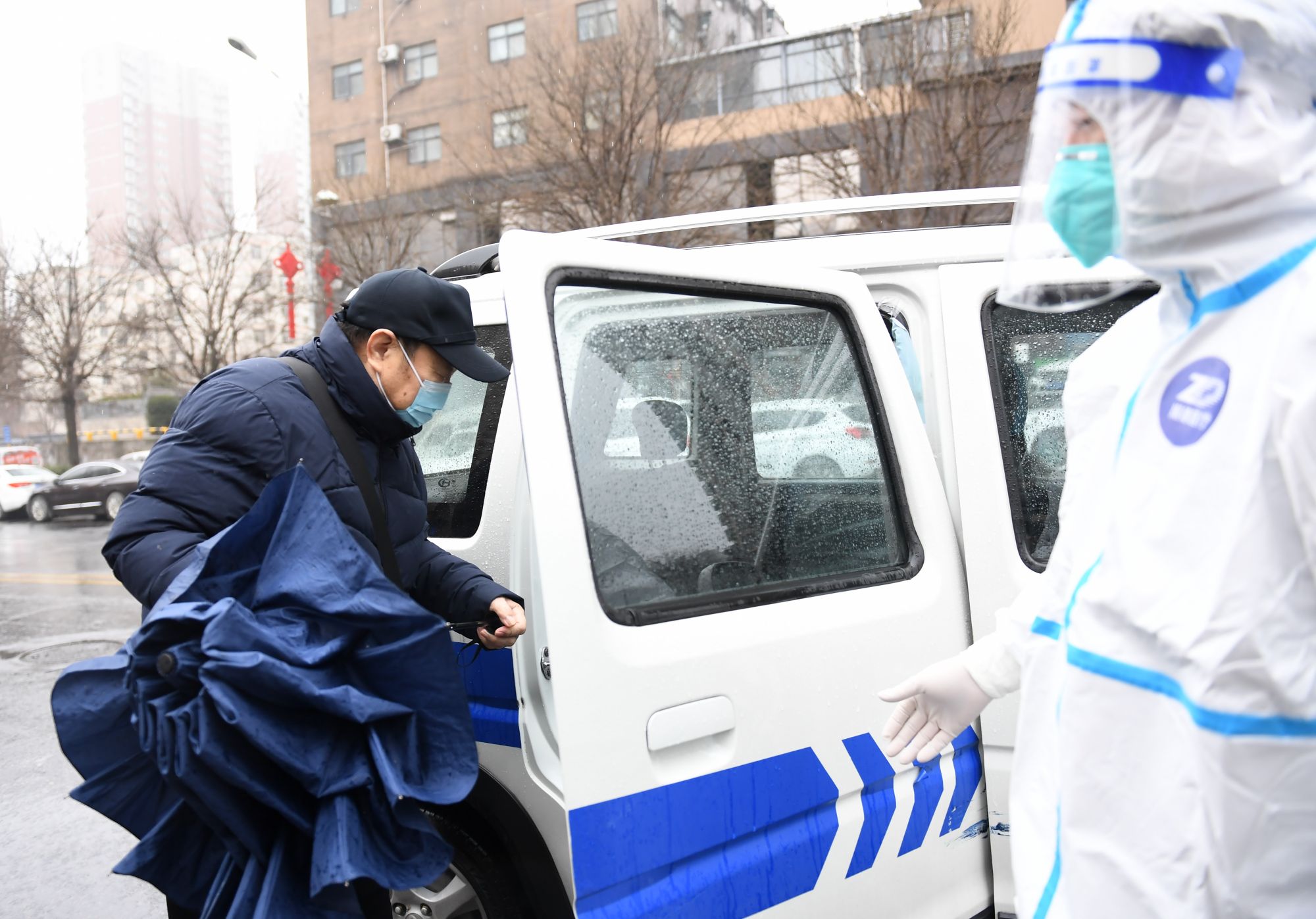 1月8日,在西安市莲湖区上和城小区,龙首西南社区安排专车接送患病居民(左)前往西安市中医医院就医。新华社记者 李一博 摄