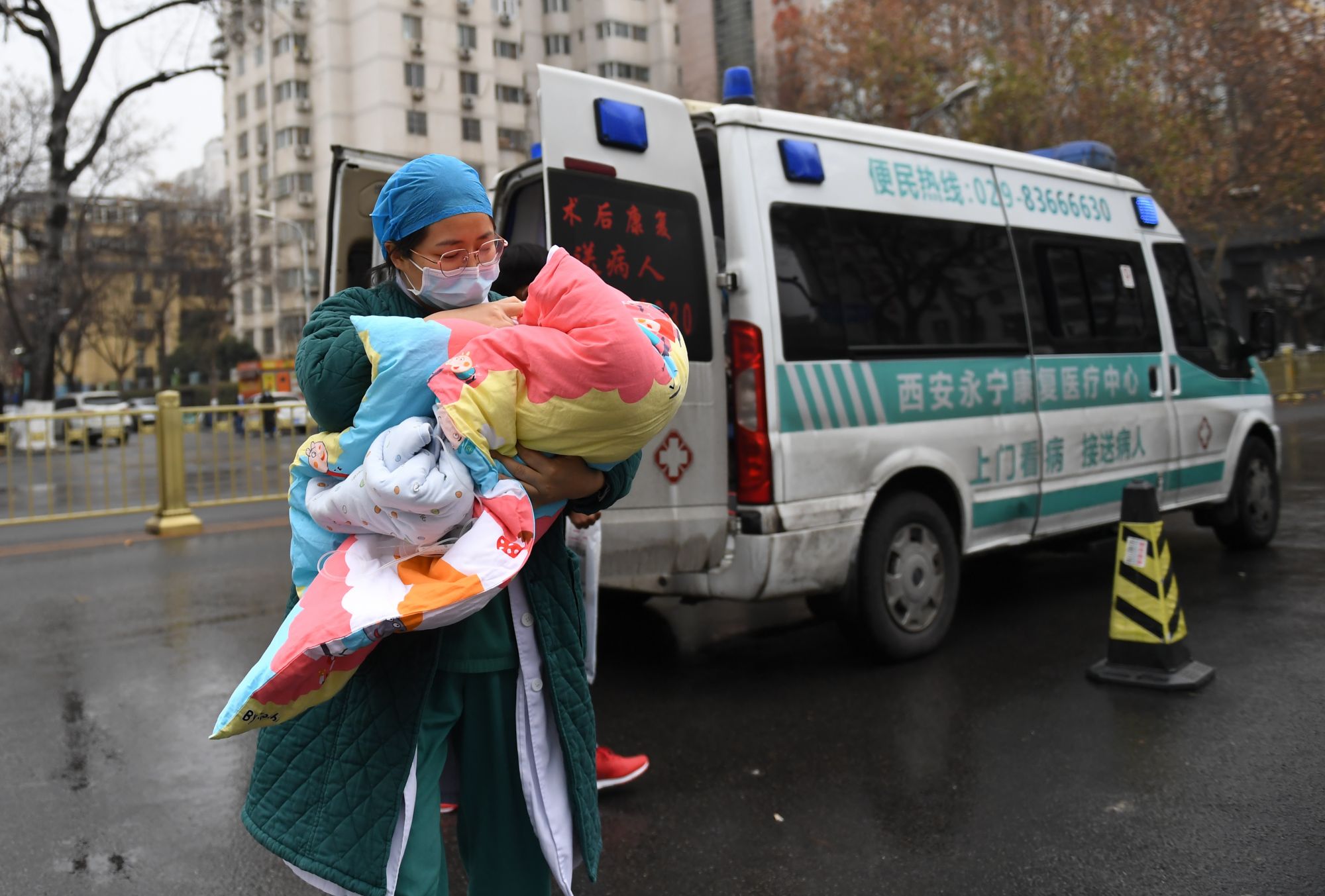 1月8日,在西安交通大学第二附属医院,儿科医生王莉接诊一名被救护车转运就医的婴儿。新华社记者 李一博 摄