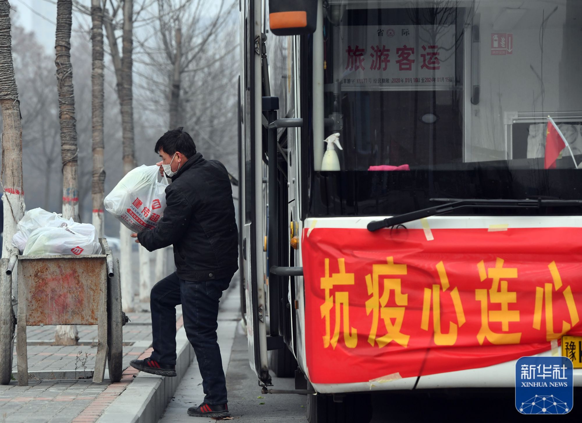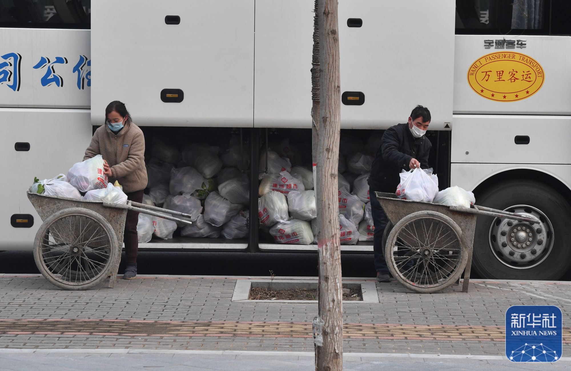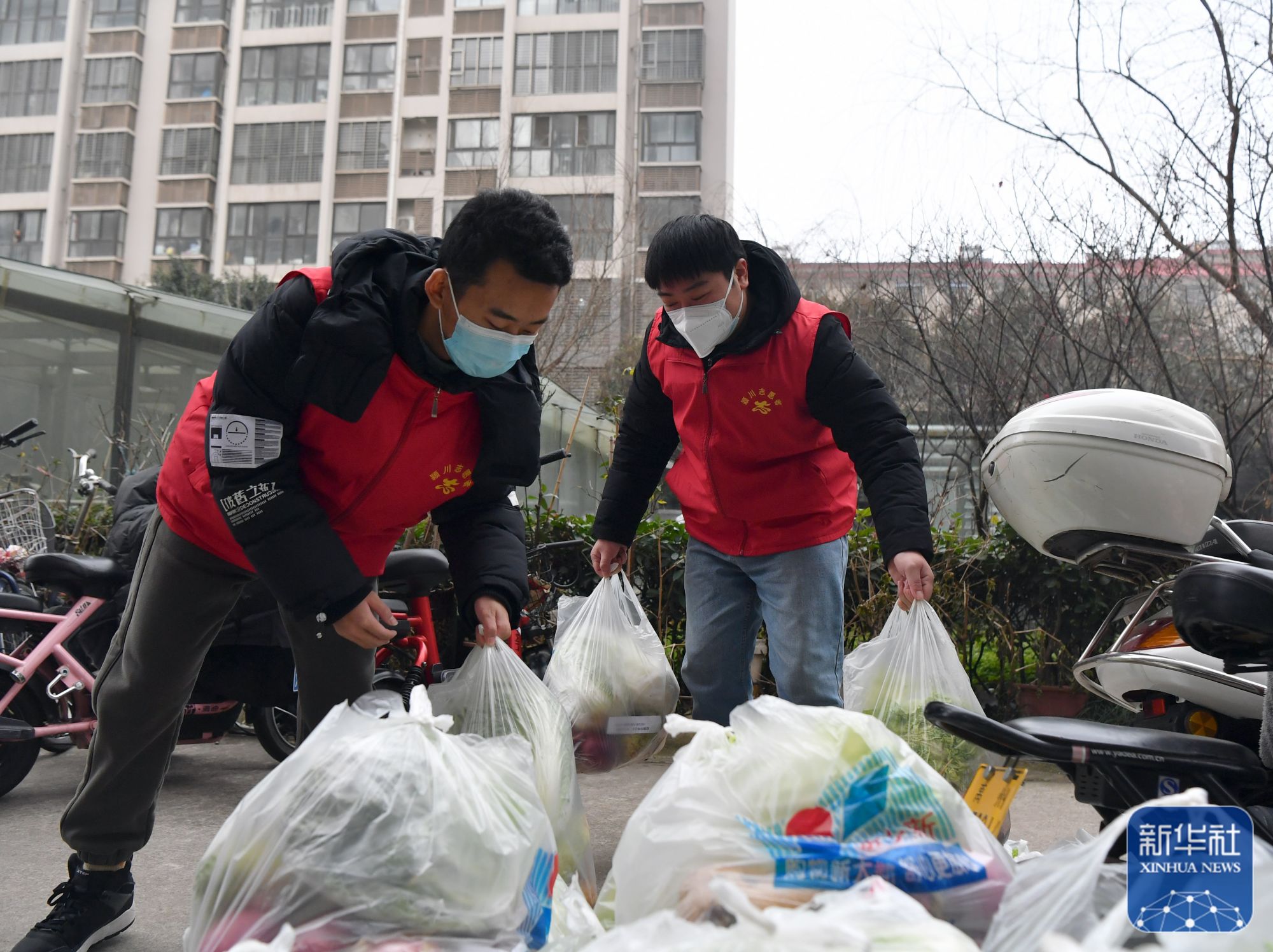 ↑1月10日,在禹州市永和苑社区,志愿者在搬运蔬菜包。