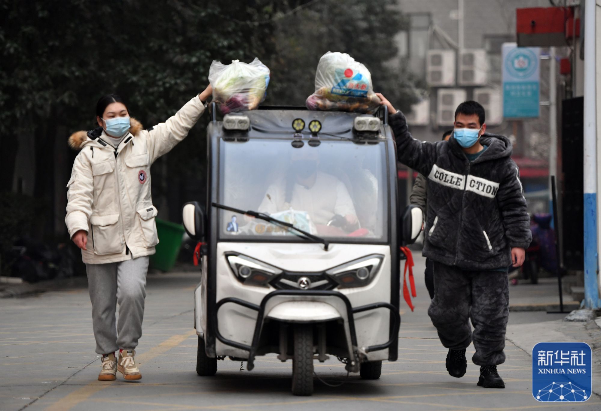↑1月10日,在禹州市永和苑社区,居民代表驾驶三轮车运送蔬菜包。
