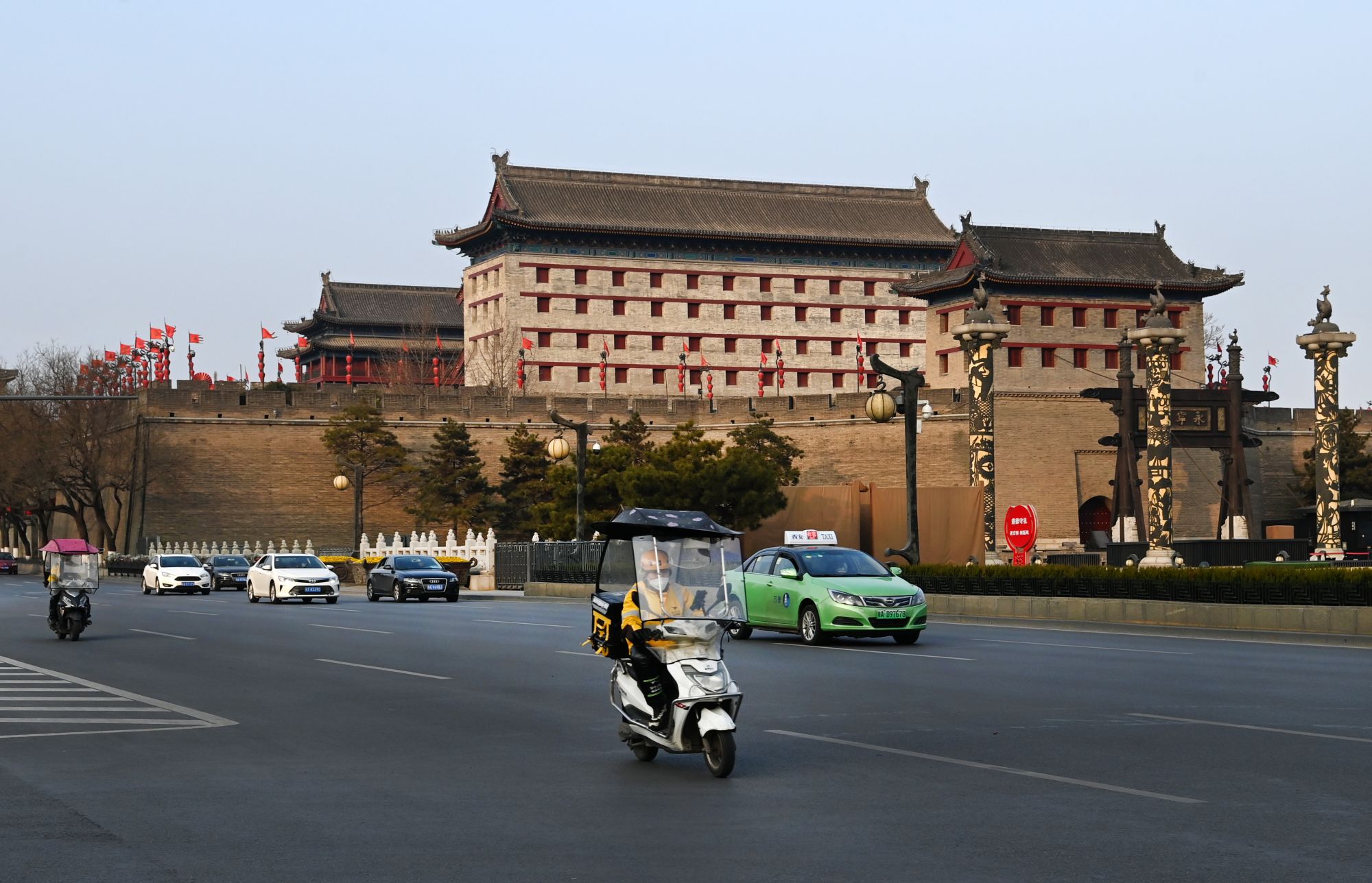 1月10日,快递人员骑行在西安市南门外道路上。新华社记者 陶明 摄