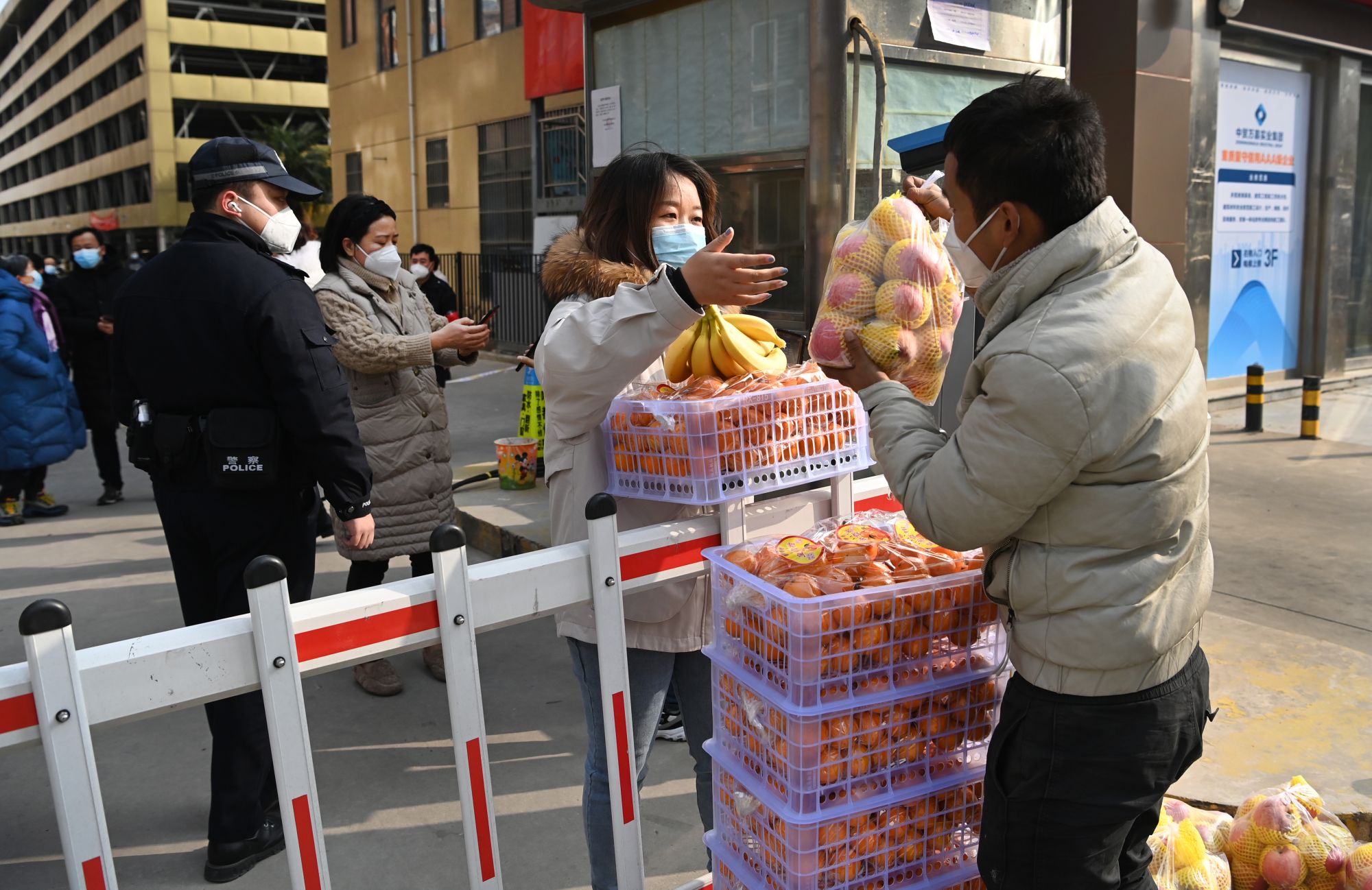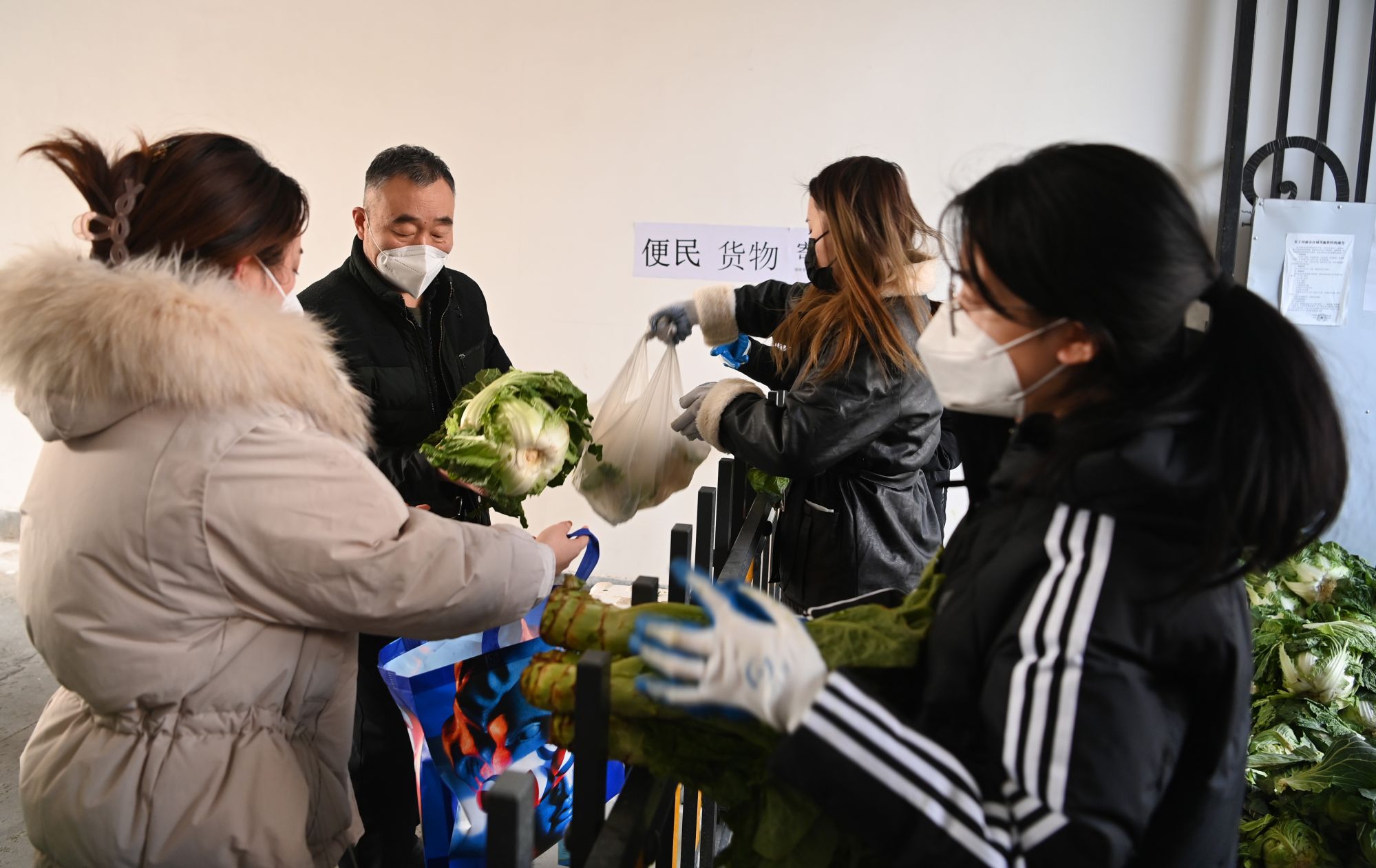 1月10日,雁塔区科技路一小区的工作人员在为居民配送爱心人士捐赠的蔬菜。新华社记者 陶明 摄