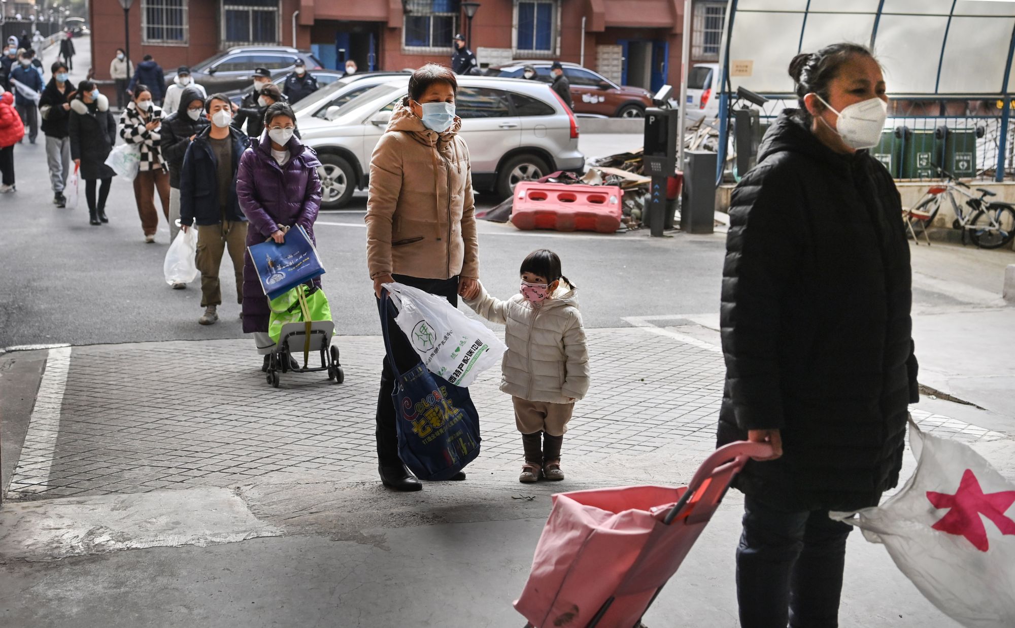1月10日,雁塔区科技路一小区的居民排队领取爱心人士捐赠的生活物资。新华社记者 陶明 摄