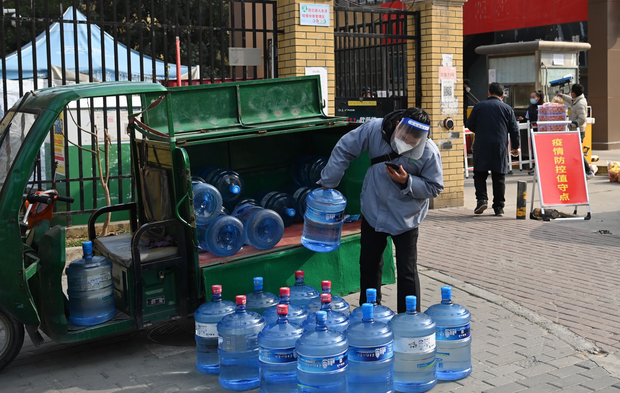 1月10日,一家快递企业员工在为莲湖区一小区配送纯净水。新华社记者 陶明 摄