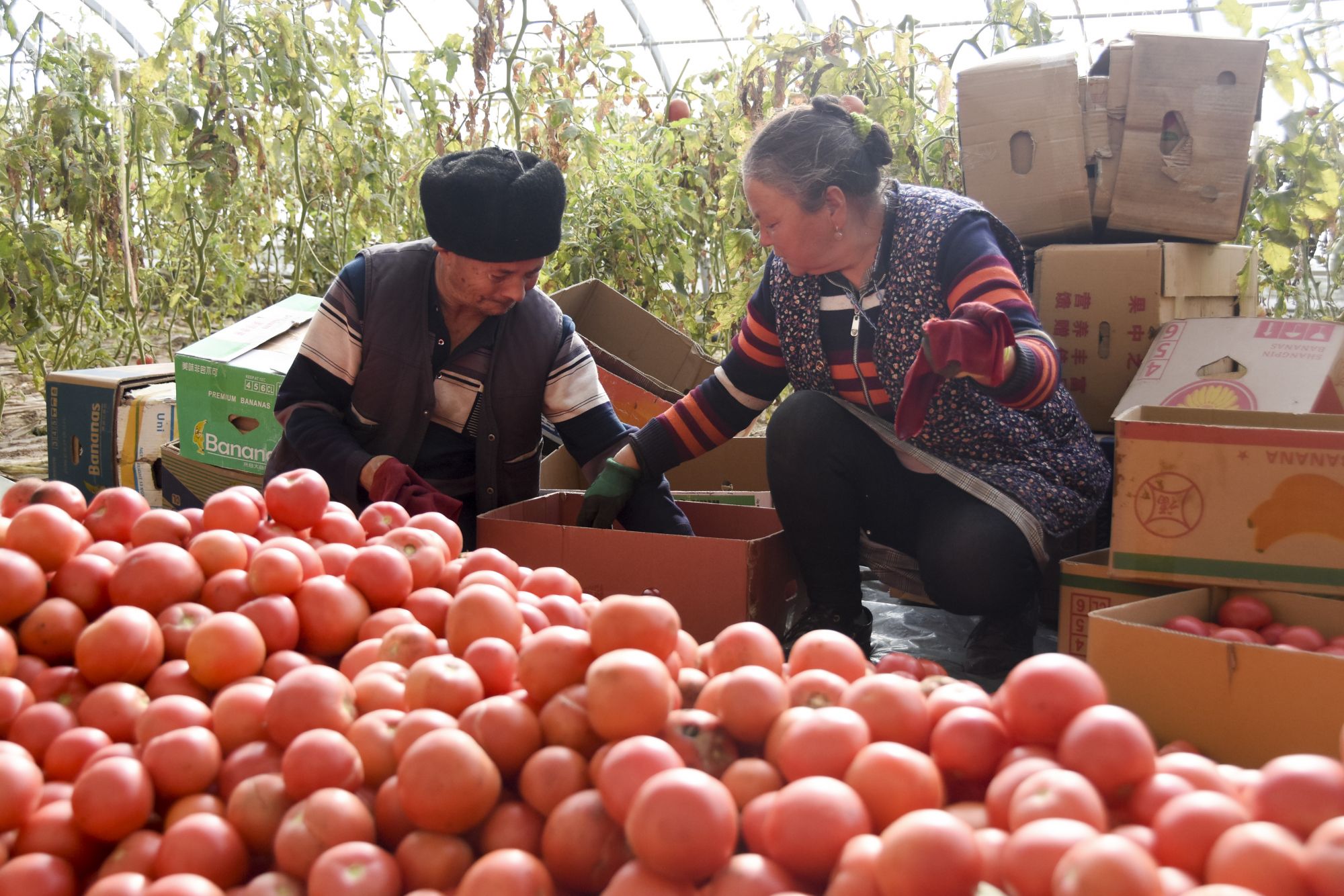 新疆叶城县阿克塔什镇居民吐逊马木提·依明的父母将收获的西红柿装箱(2021年11月19日摄)。新华社记者 顾煜 摄