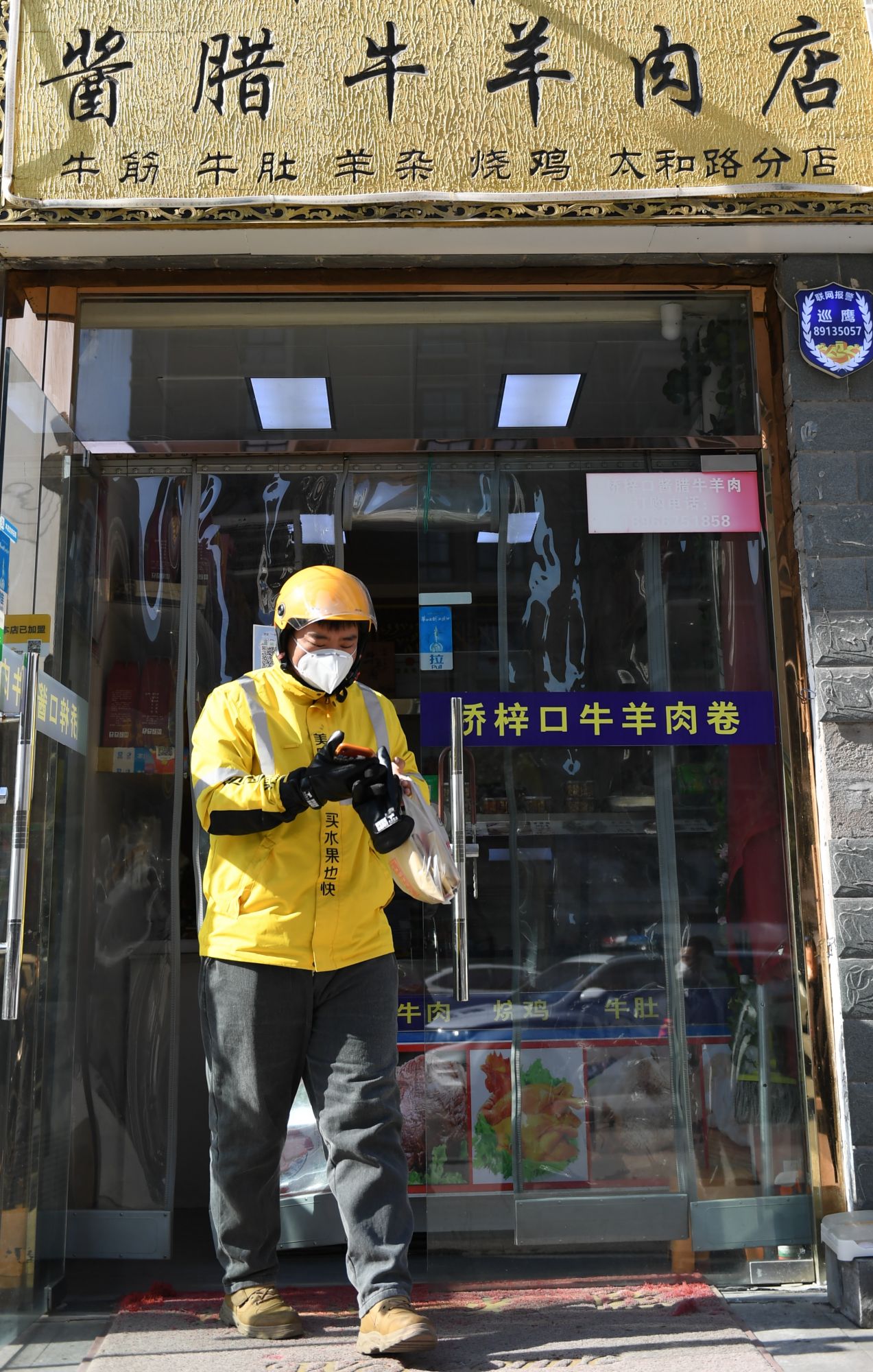 1月12日,外卖骑手孔维建在西安市太和路一家牛羊肉店取顾客外卖。新华社记者 李一博 摄