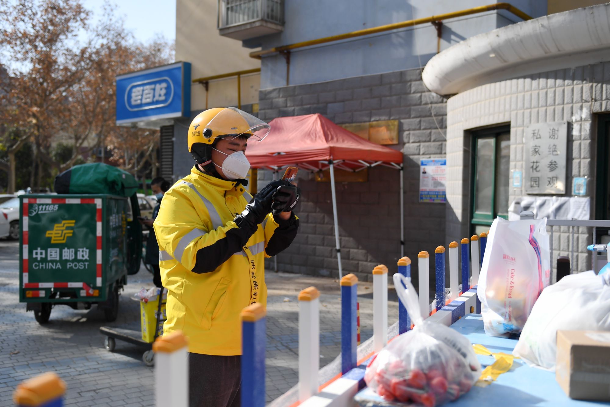 1月12日,外卖骑手孔维建按照无接触配送要求,将外卖送至西安市新城区一小区。新华社记者 李一博 摄