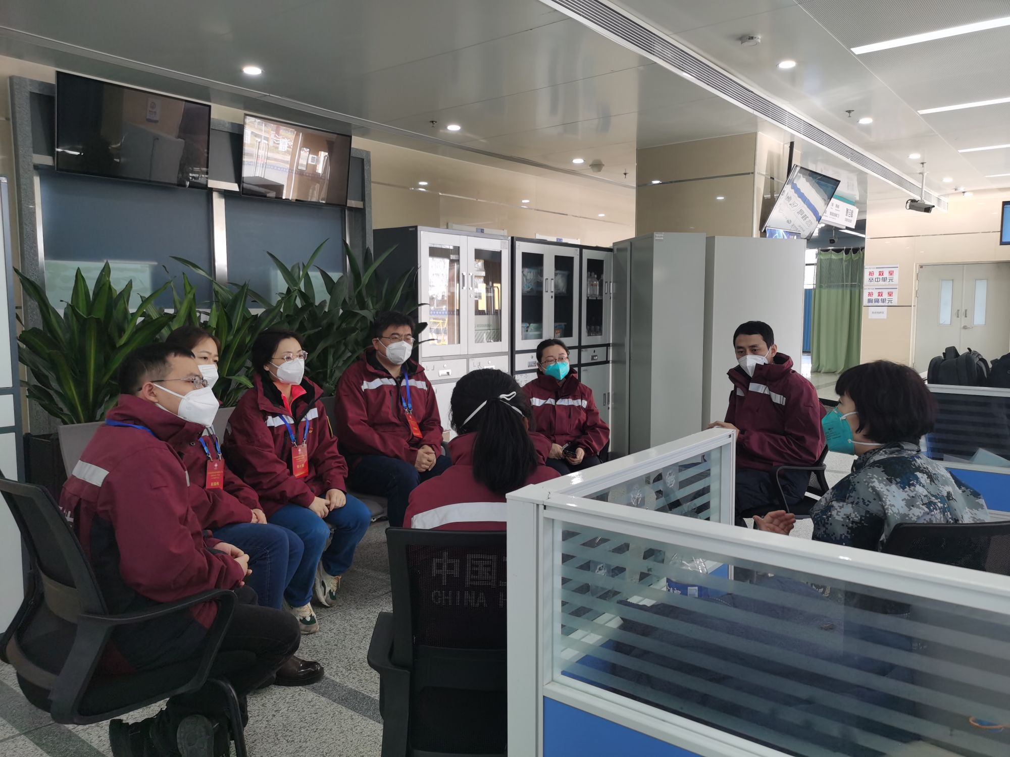 西安市精神卫生中心派出的心理援助队员开会讨论心理援助方案。(受访对象供图)