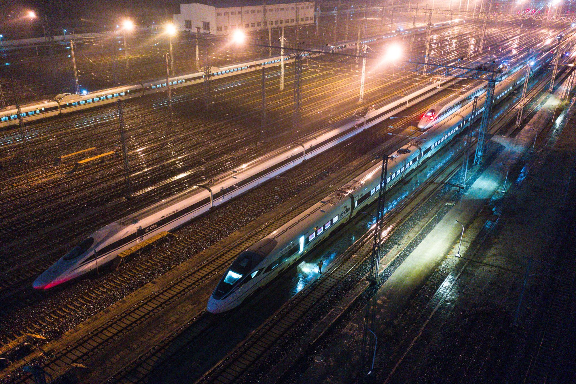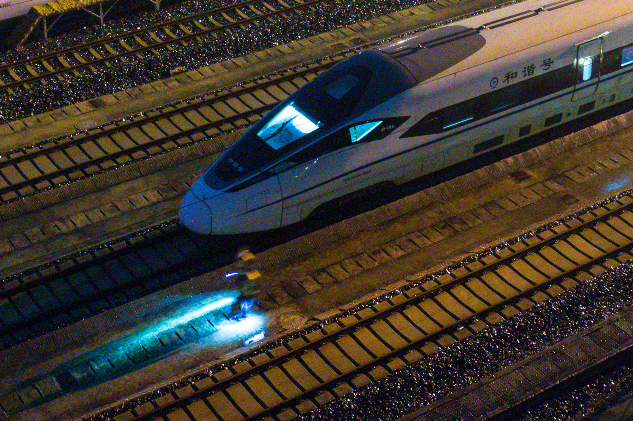 1月16日,地勤机械师洪昊阳(左)、祁鑫在动车组旁巡查。