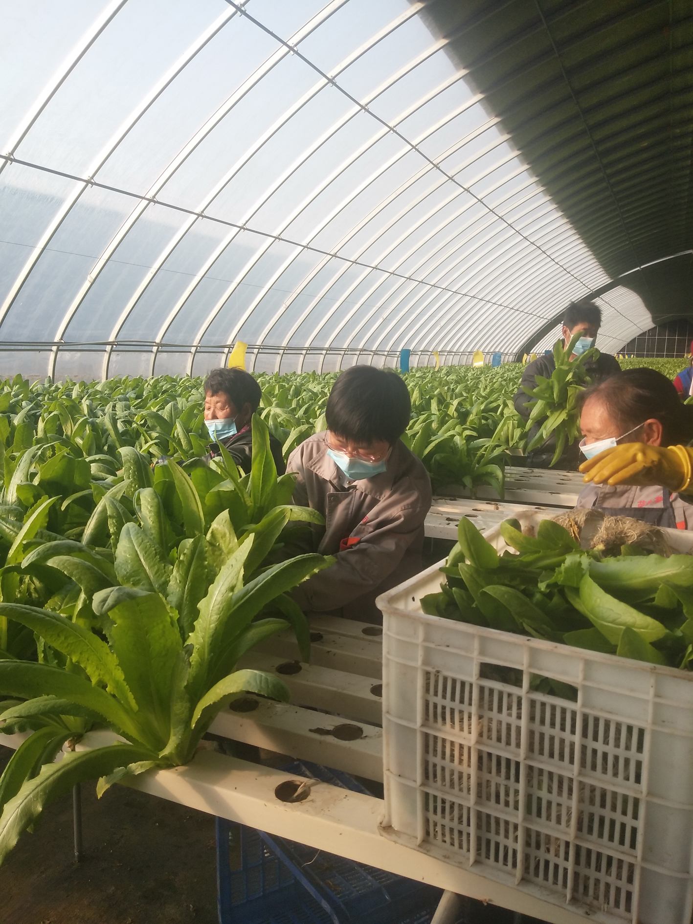 在天津苗牧集团有限公司的蔬菜基地里,工人们正在抢收油麦菜。