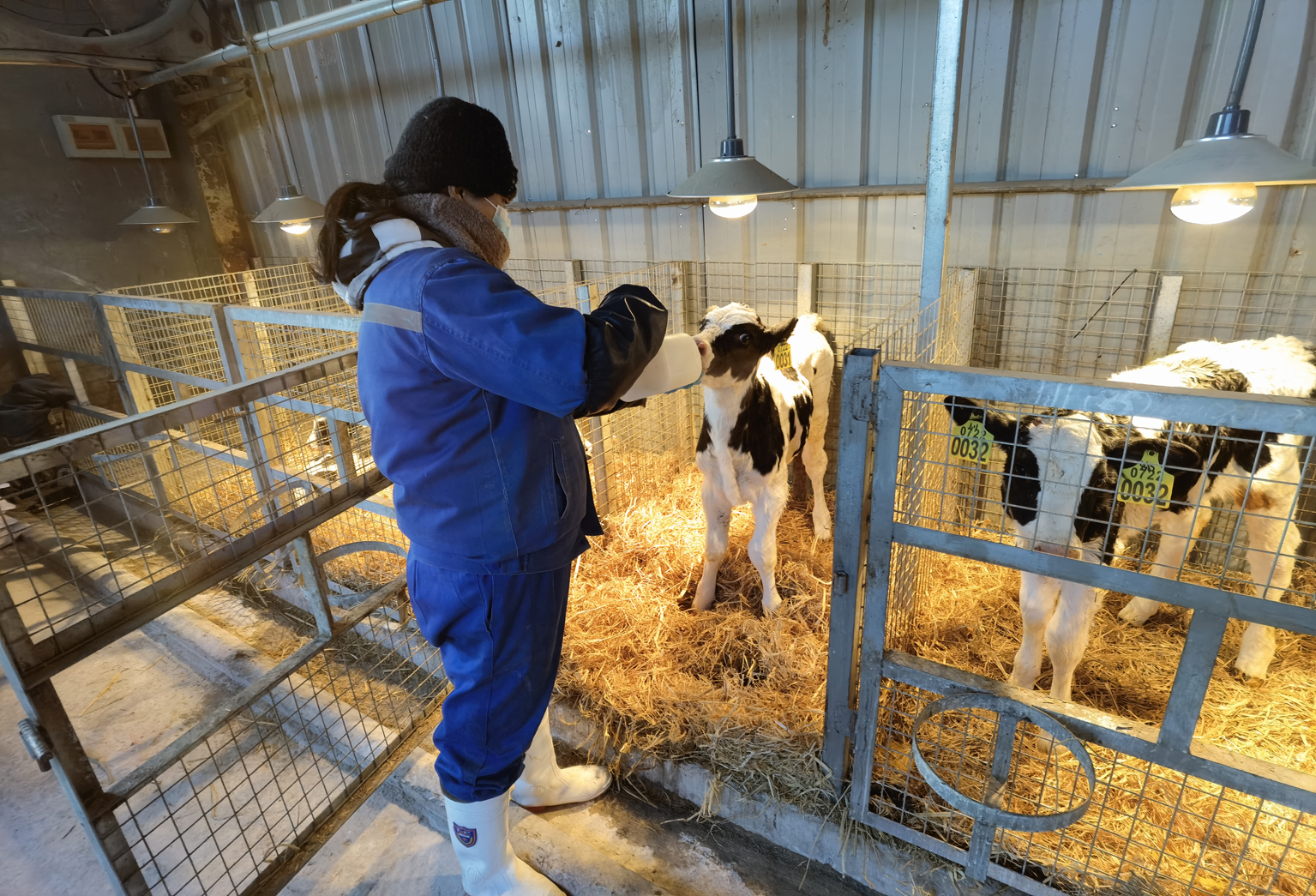 在天津嘉立荷牧业集团有限公司所属的一座奶牛场里,工作人员正在为小犊牛喂奶。