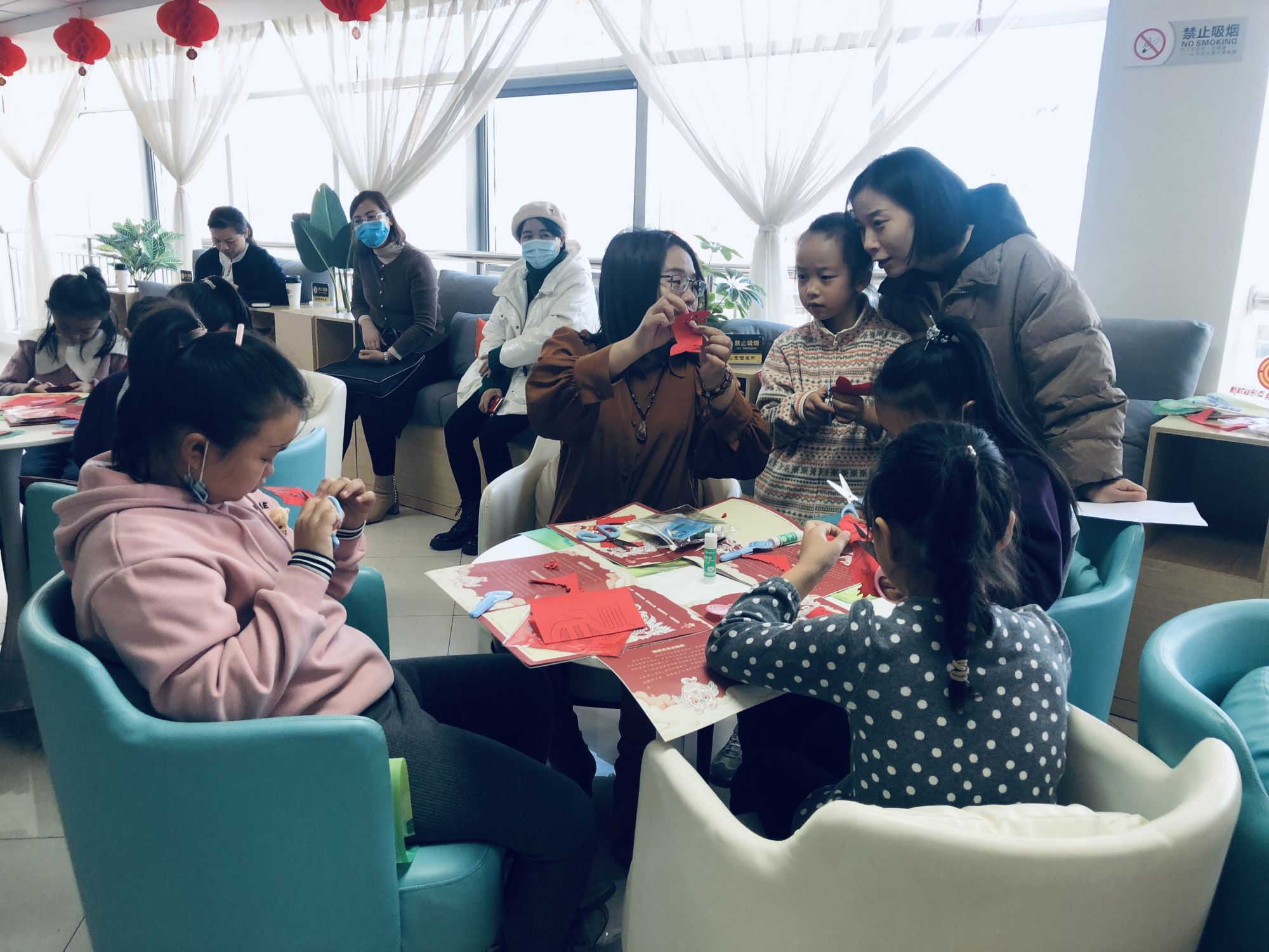 寒假期间,银川市金凤区通福社区为辖区青少年准备了多项文化活动,这是剪纸“非遗”传承人李剑正在指导孩子们制作手工剪纸。新华社记者 艾福梅 摄