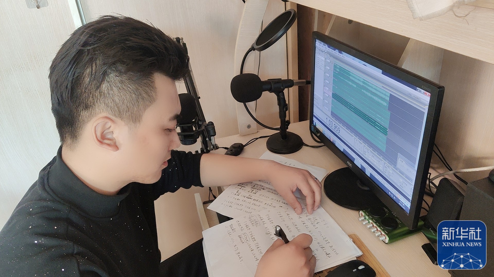 ↑天津评剧院青年演员齐梓路在录制评剧唱段《天津加油》。(天津北方演艺集团供图)