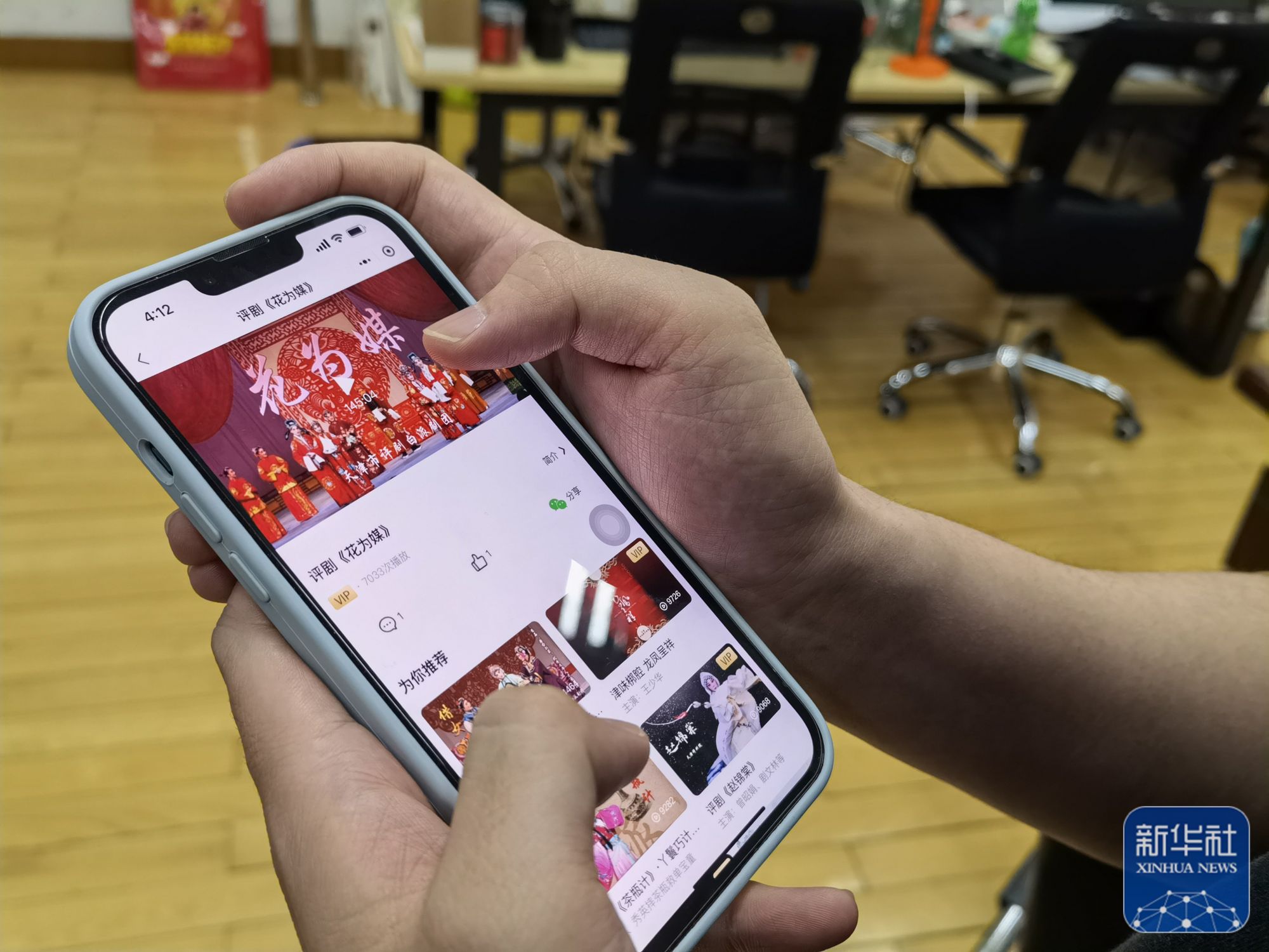↑一位市民用手机上的微信小程序“小北剧场”观看评剧《花为媒》。(天津北方演艺集团供图)