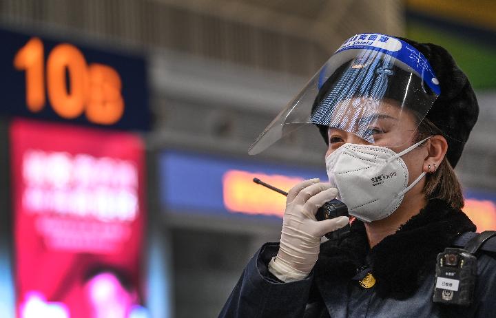 1月16日,西安北站检票客运员向站台联控检票车次信息。新华社记者 陶明 摄