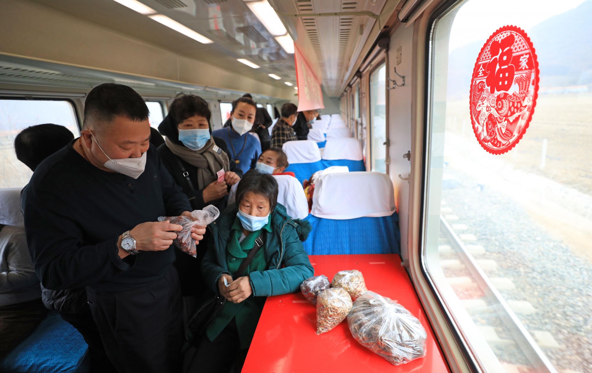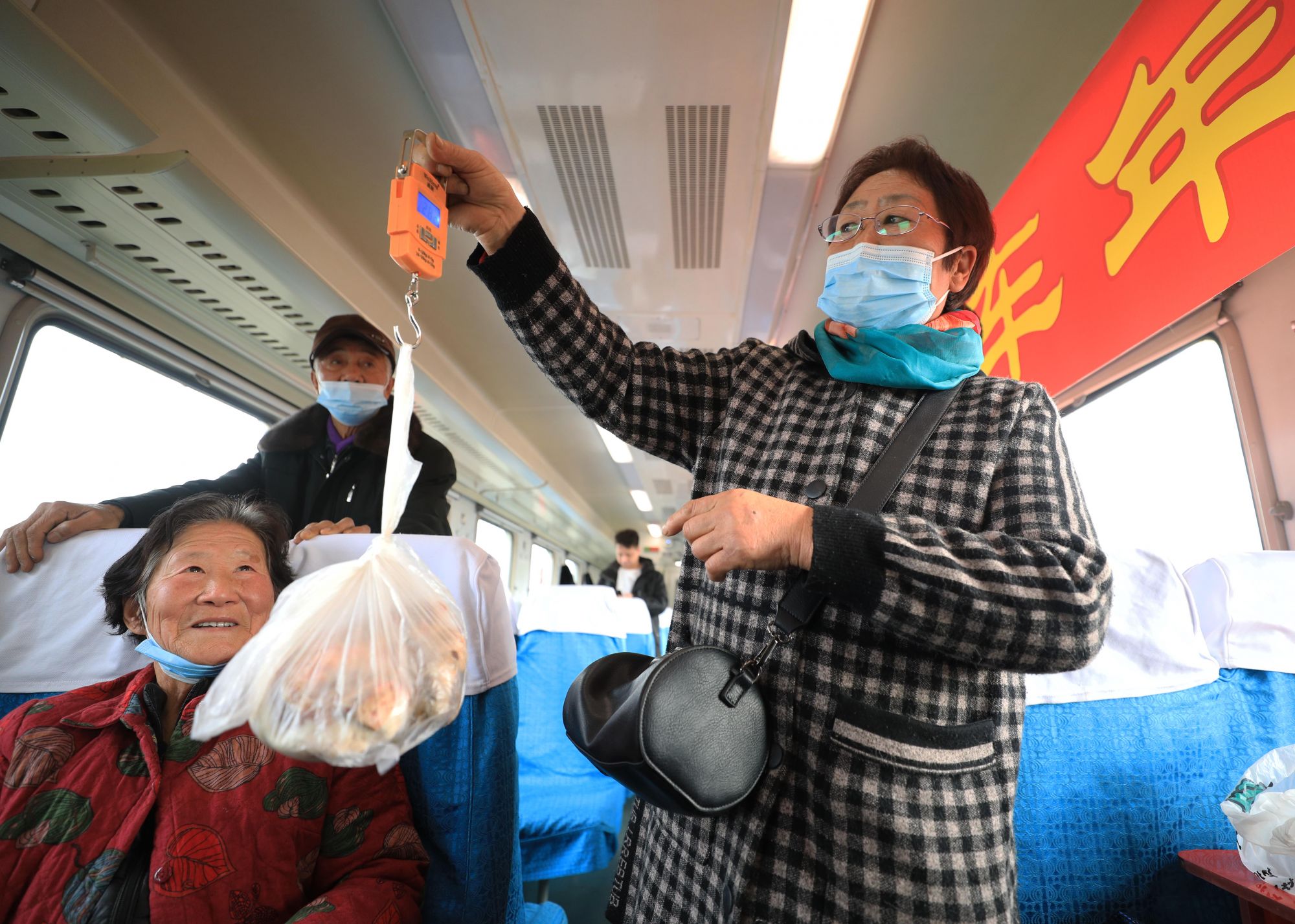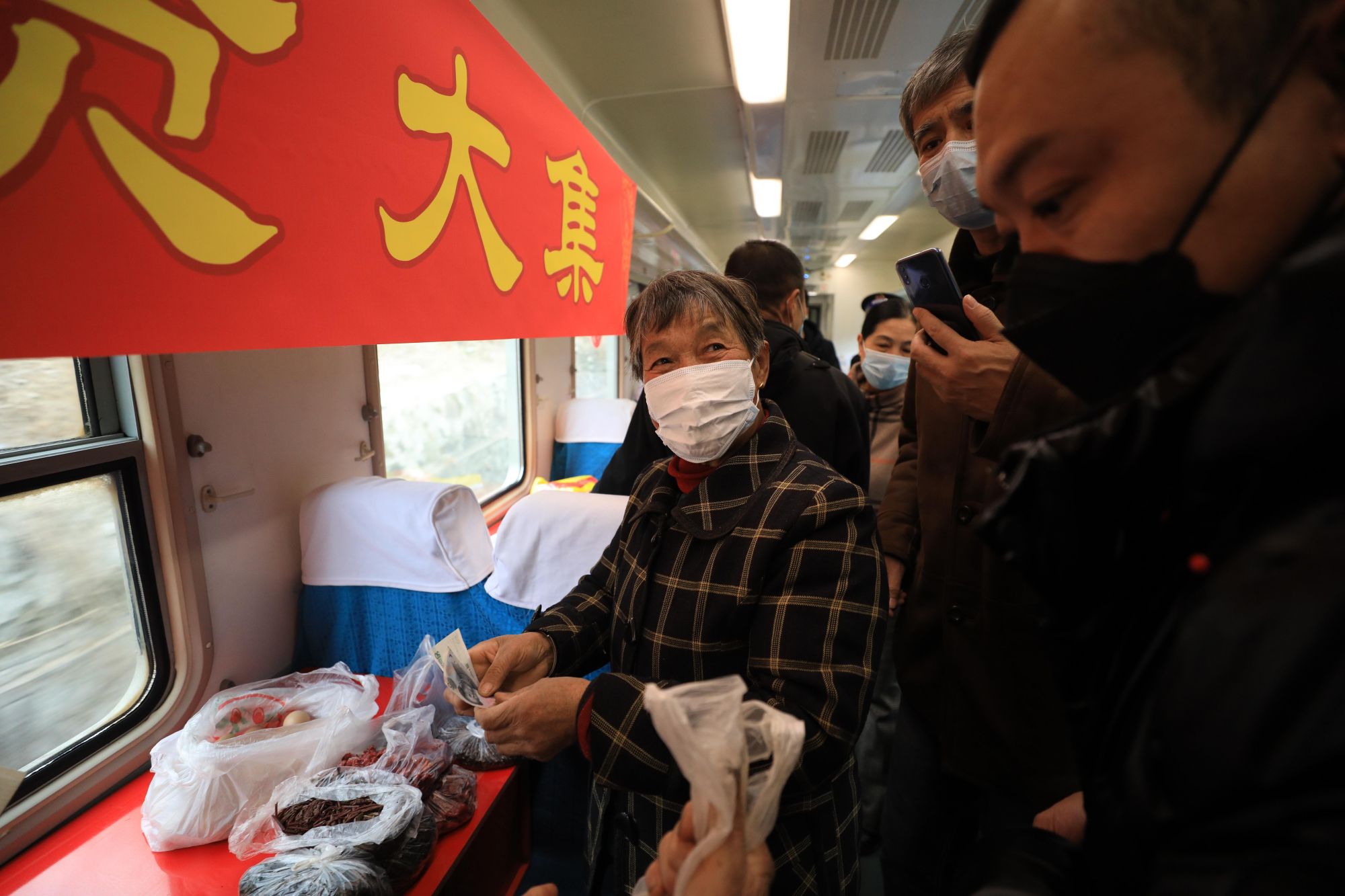 吉林通化至辽宁丹东的4318/7次列车是一辆行驶在东北东部山区的慢火车。为助力乡村振兴,中国铁路沈阳局集团有限公司吉林客运段在列车上开办“年货大集”。沿线各村镇的农民不用等到进城,就可在车厢里售卖自家山货。