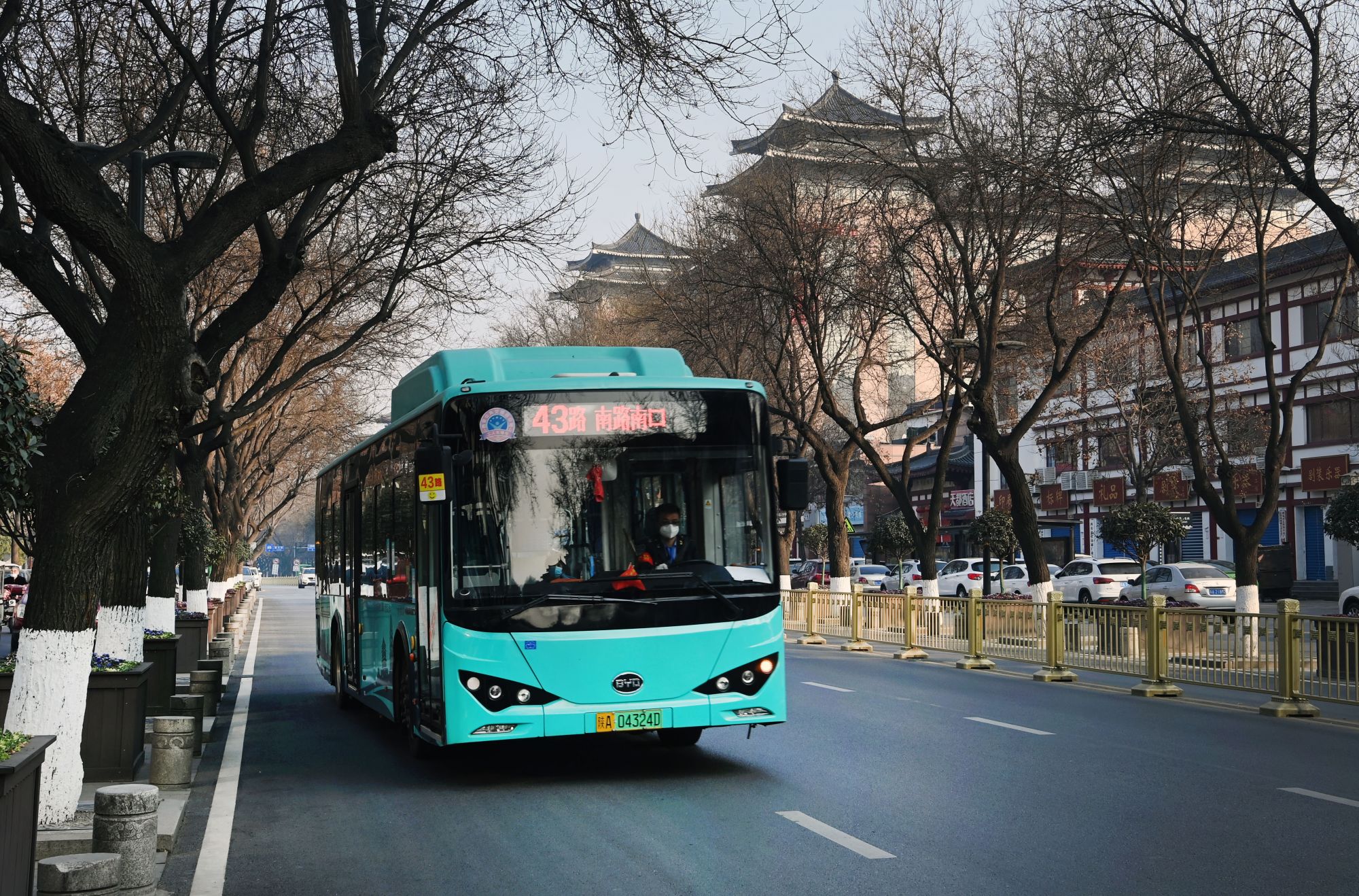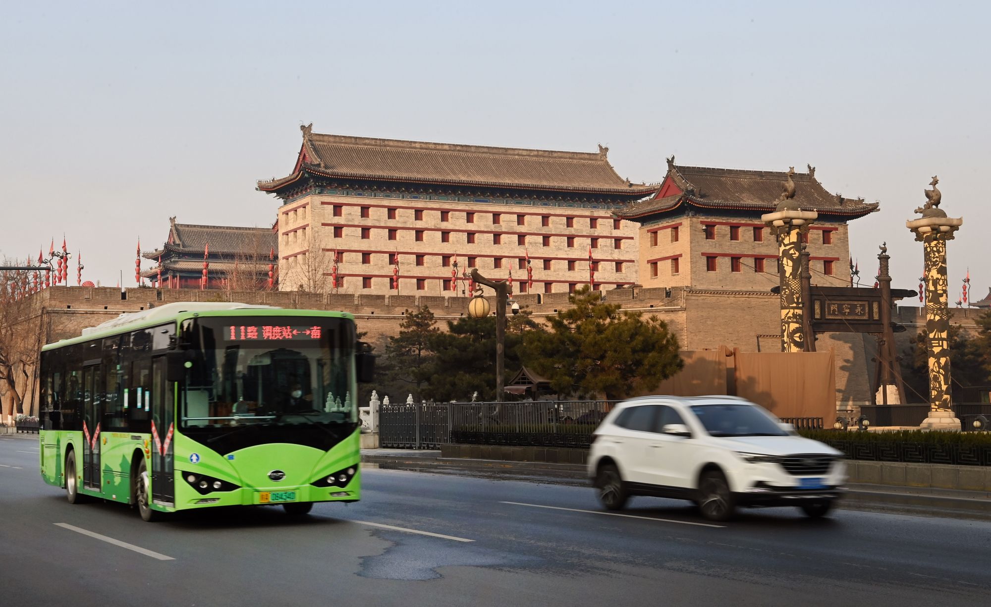 1月18日,公交车行驶在西安市永宁门外的道路上。新华社记者 陶明 摄