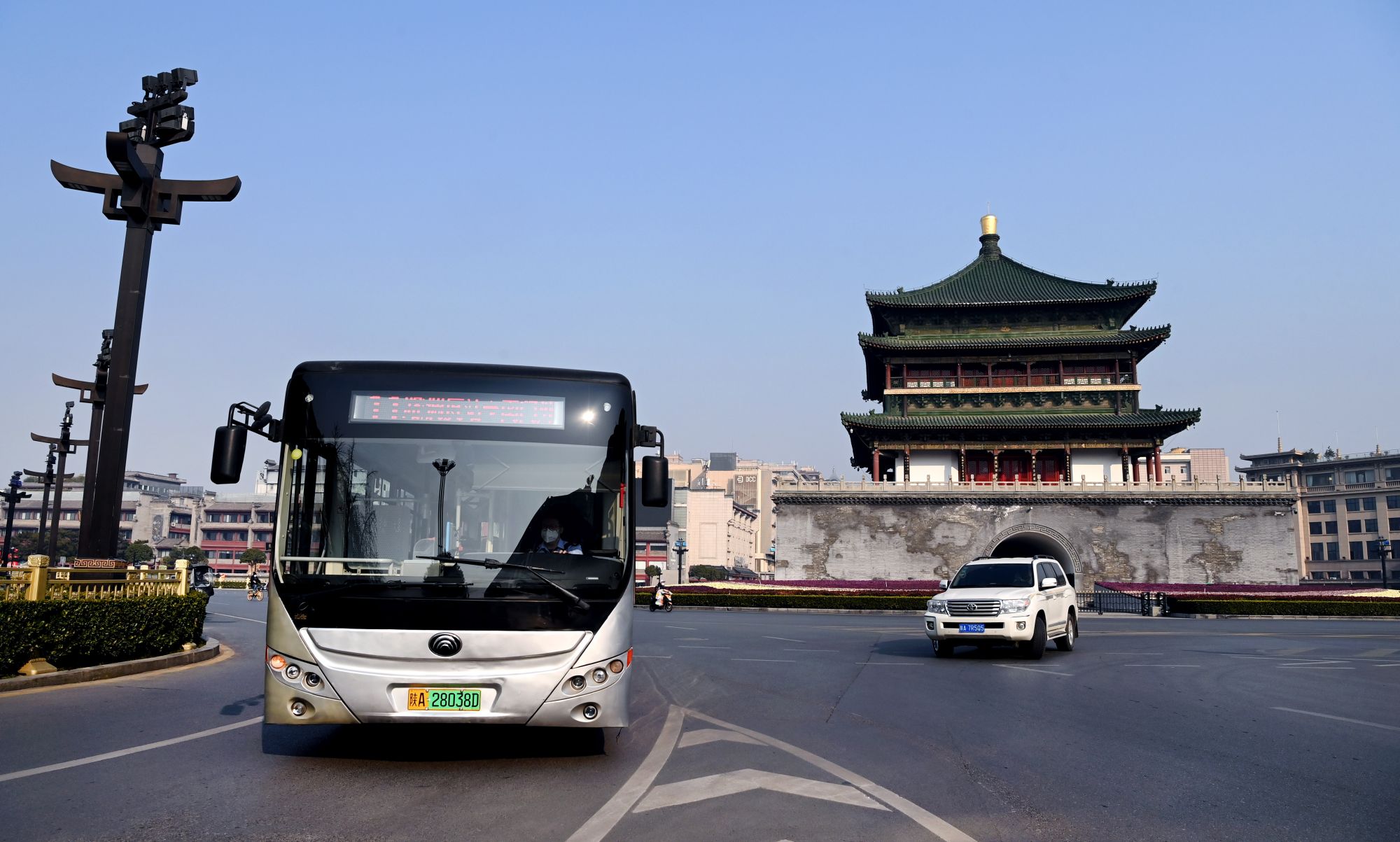 1月18日,公交车行驶在西安钟楼附近。新华社记者 陶明 摄