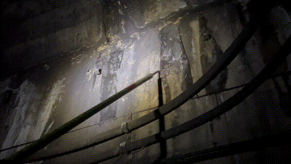 隧道里越走越黑,工人不但要用强光手电检查拱顶和侧壁,还要注意脚下——扣件、轨枕、电缆盒很容易把人绊倒。