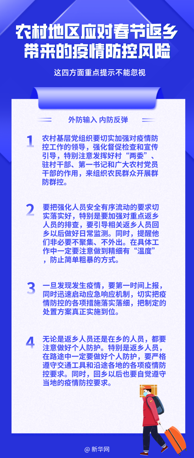 春节将至,农村地区的外出务工、上学人员集中返乡,如何降低流动人员带来的疫情传播风险?春节期间农民朋友走亲访友、举办酒席,在疫情防控方面有哪些提醒?来听专家怎么说。