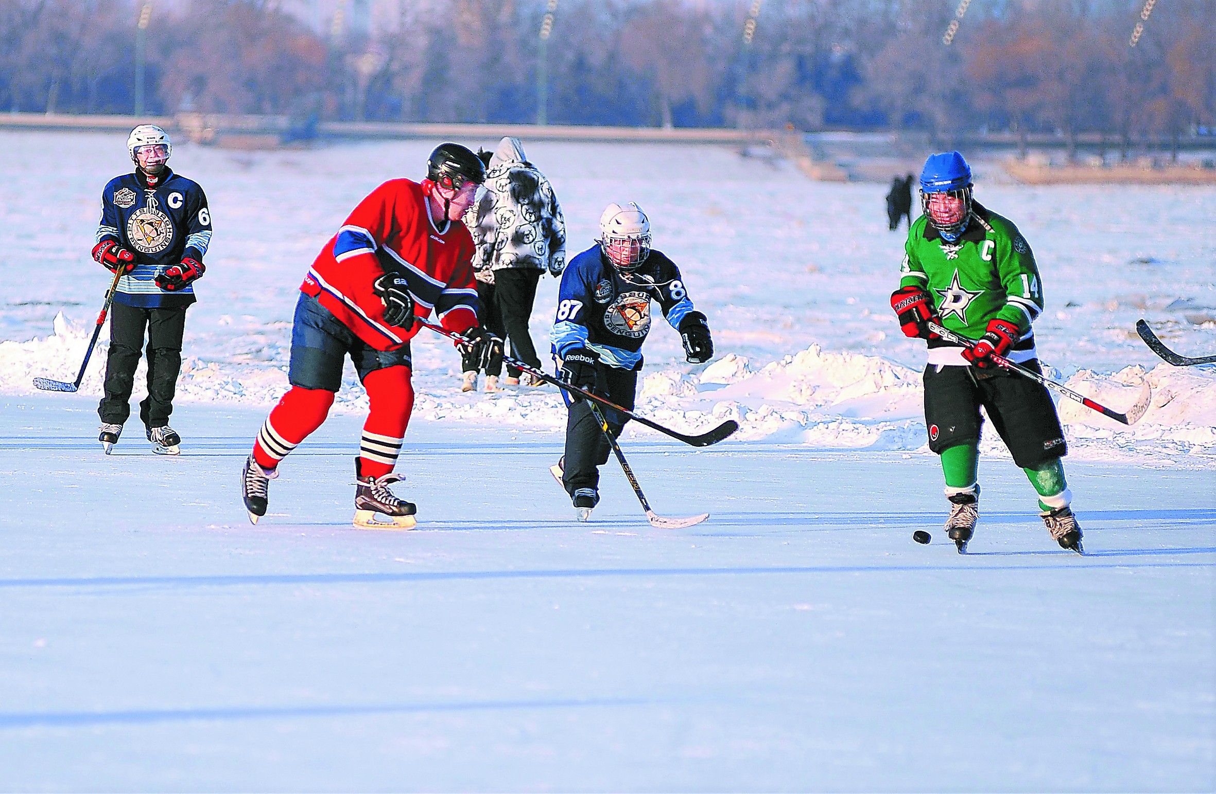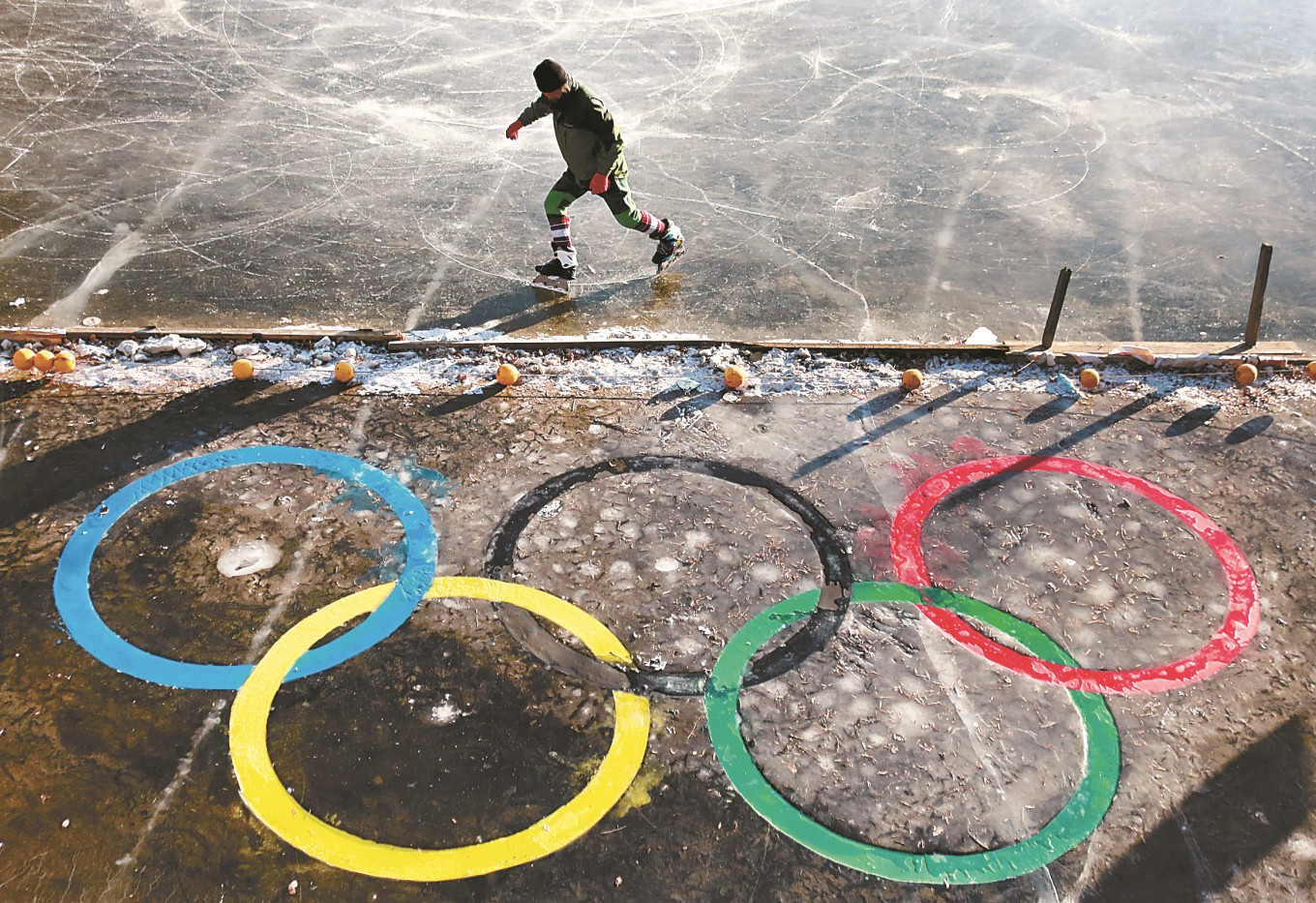 滑冰爱好者在沈阳一公园冰面上的“五环”标志旁滑冰健身。