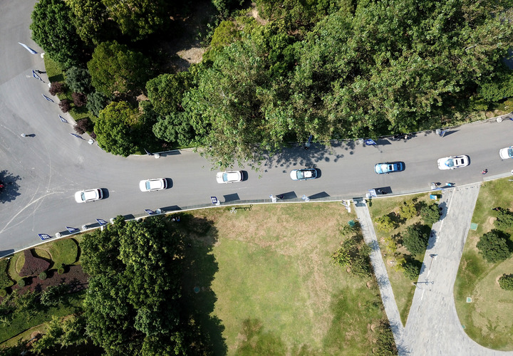 在安徽省合肥市,自动驾驶车辆准备驶入5G示范线(2020年9月3日摄,无人机照片)。新华社记者 刘军喜 摄
