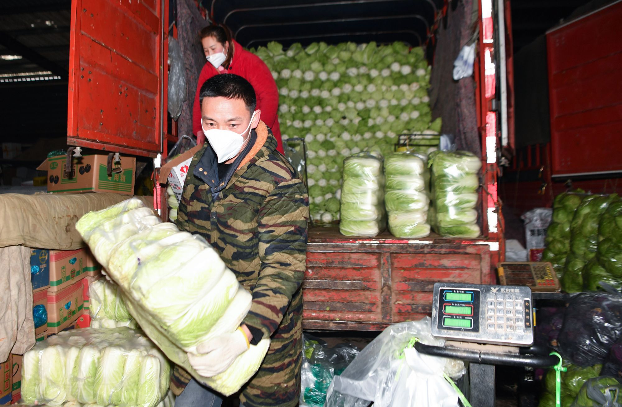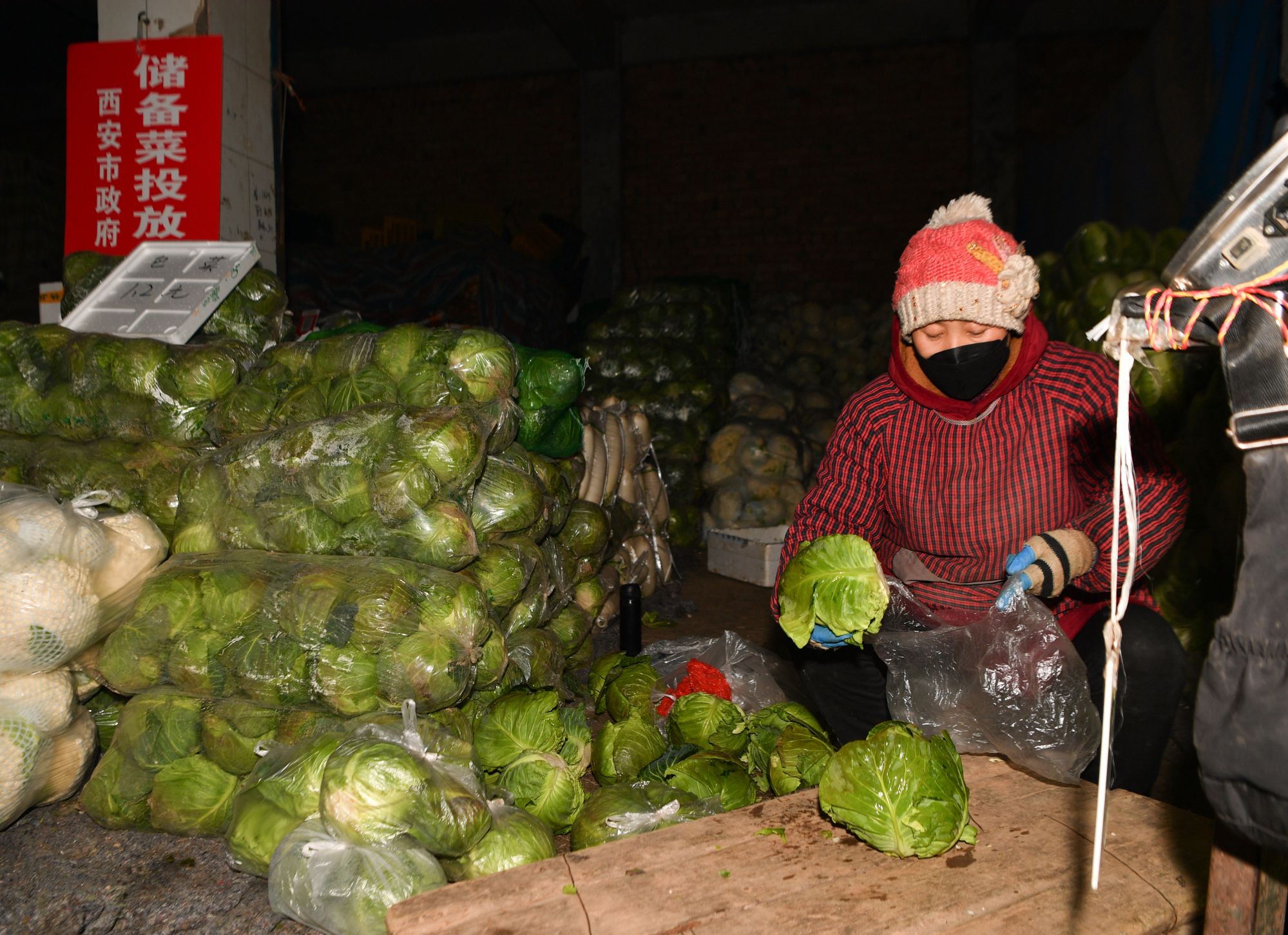 1月24日,工作人员在西安市新城区一处储备菜投放点为蔬菜称重。