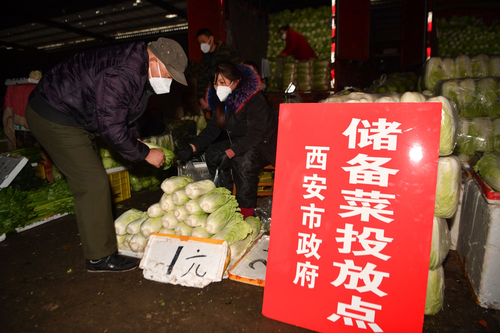 1月24日,市民(左一)在西安市新城区一处储备菜投放点购买蔬菜。