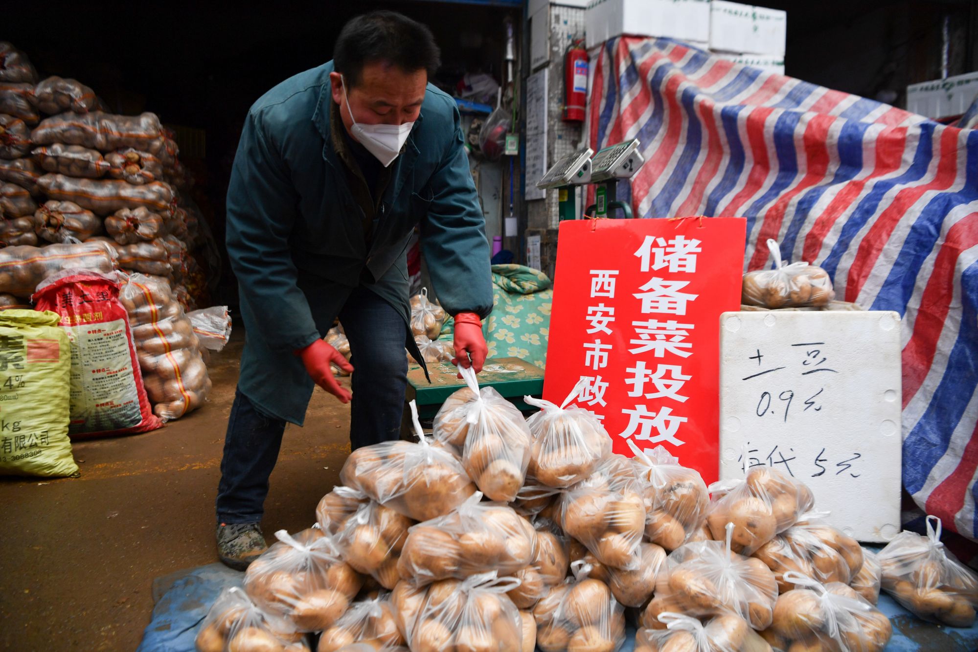 1月24日,工作人员在西安市新城区一处储备菜投放点整理土豆。