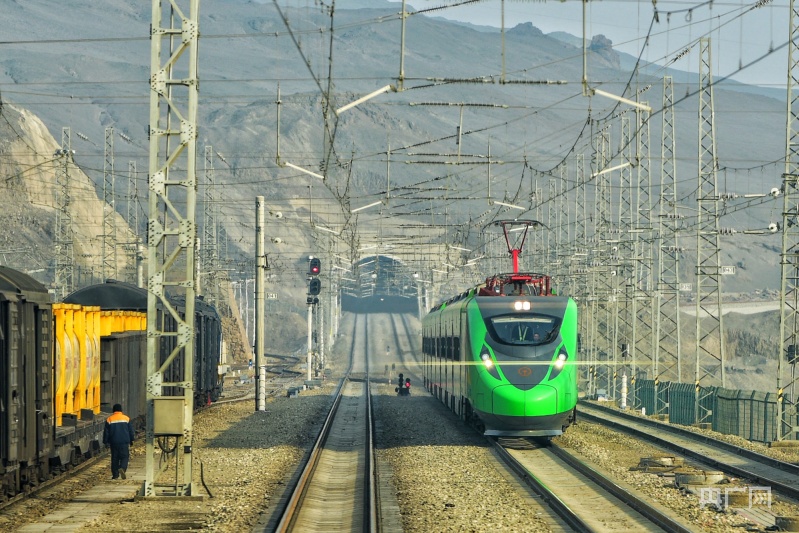 施工作业结束,一趟复兴号动车组从南疆铁路驶过。摆风亮摄 央广网发