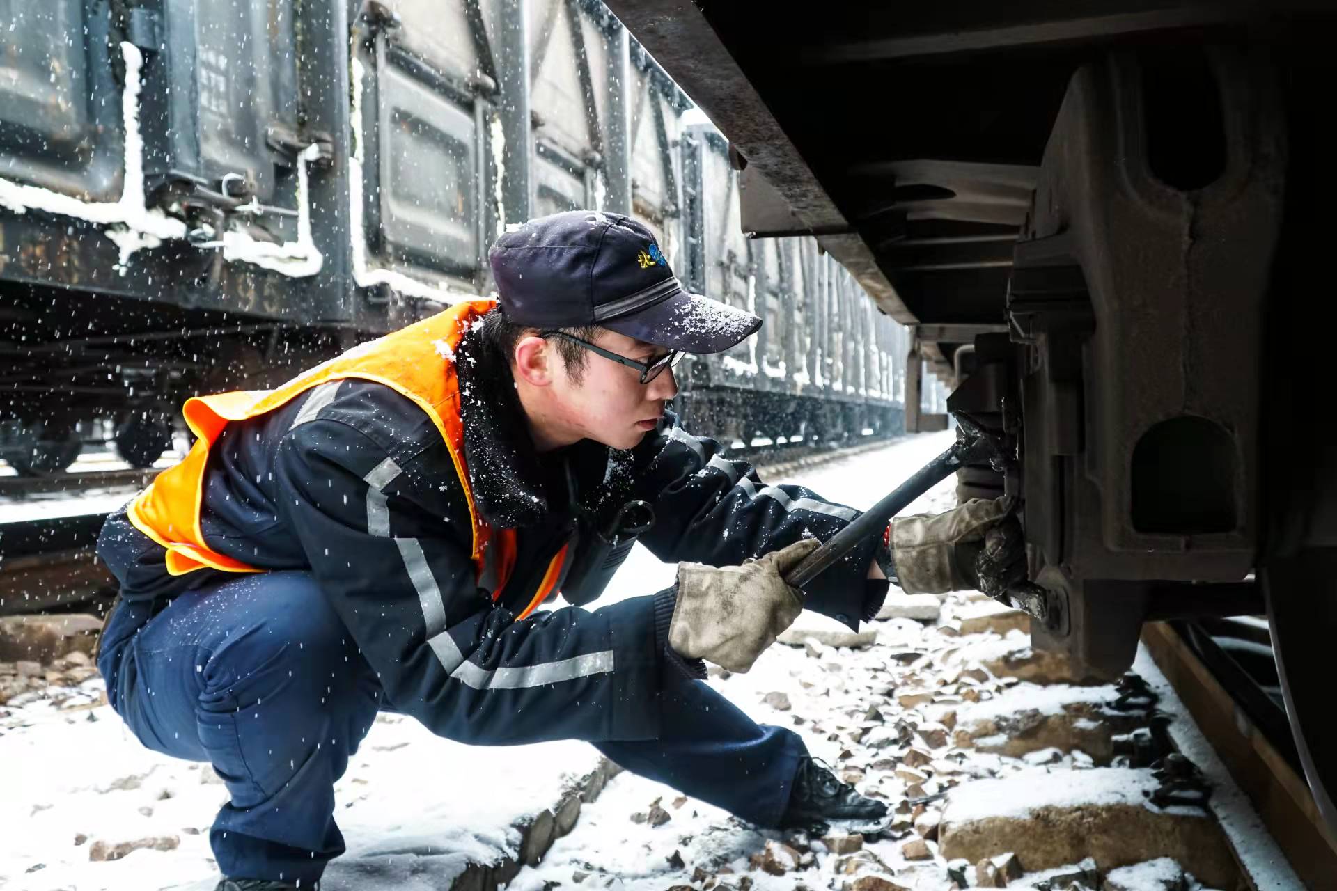 1月21日,山西境内出现降雪,中国铁路太原局集团有限公司太原北车辆段冒雪作业,对车辆各部位状态仔细检查,确保春运期间电煤列车安全运行。(中国铁路太原局集团有限公司供图)