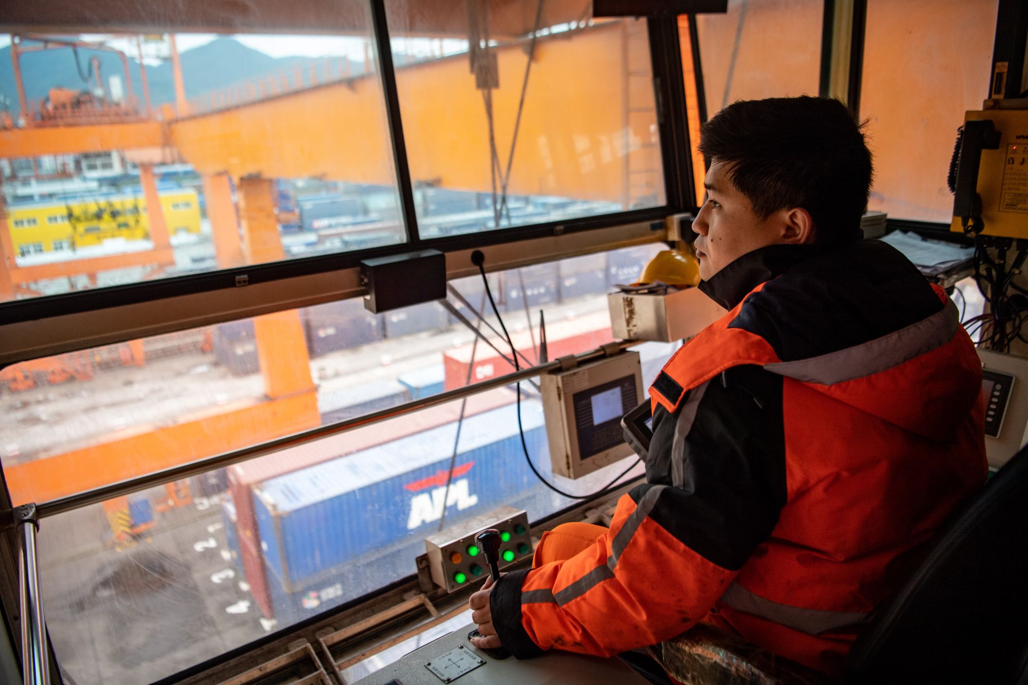 1月26日,郑雨双在司机室内操纵龙门吊起吊集装箱。 新华社记者 唐奕 摄