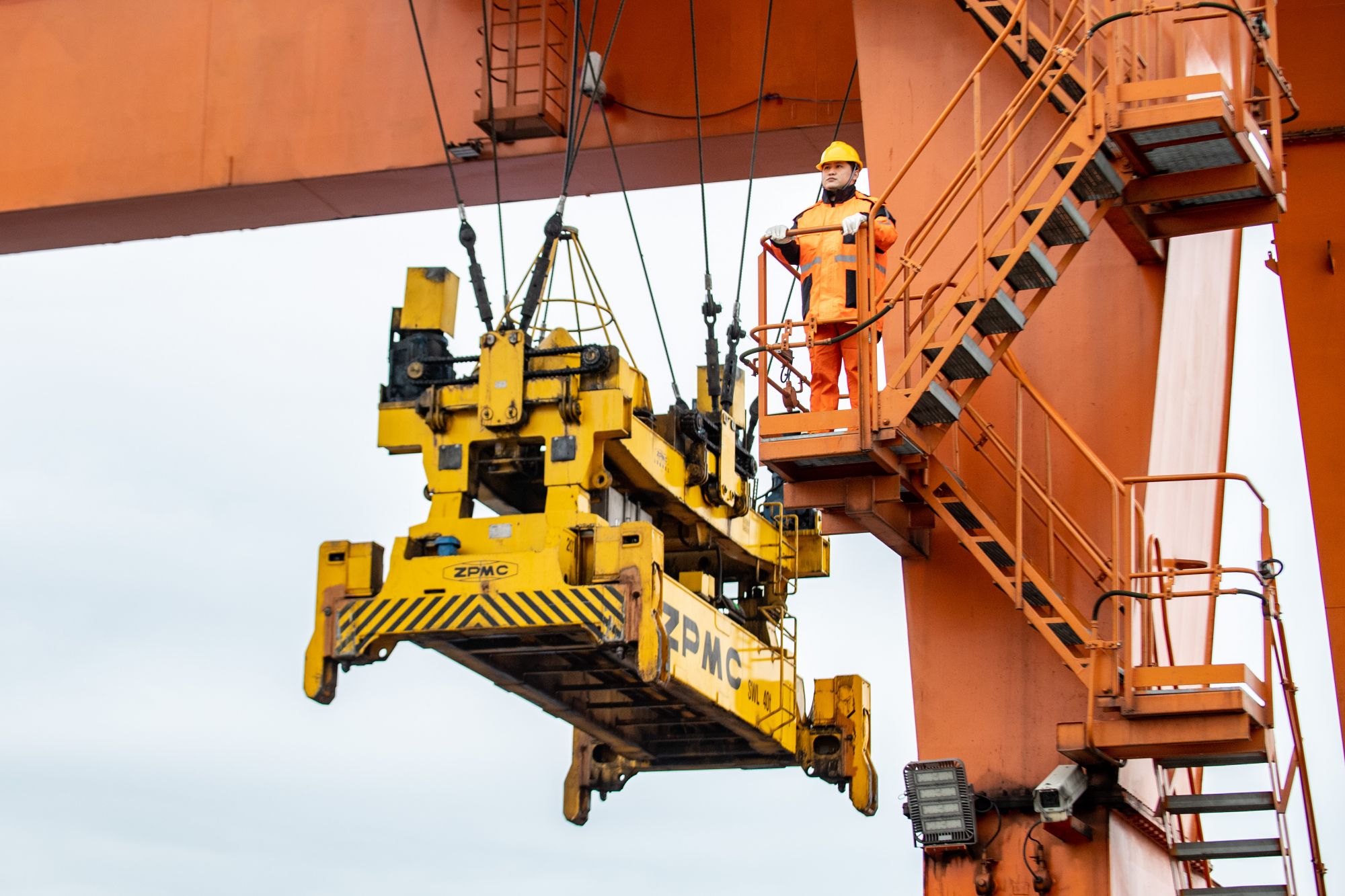 1月26日,郑雨双向16米高的龙门吊司机室攀爬。 新华社记者 唐奕 摄