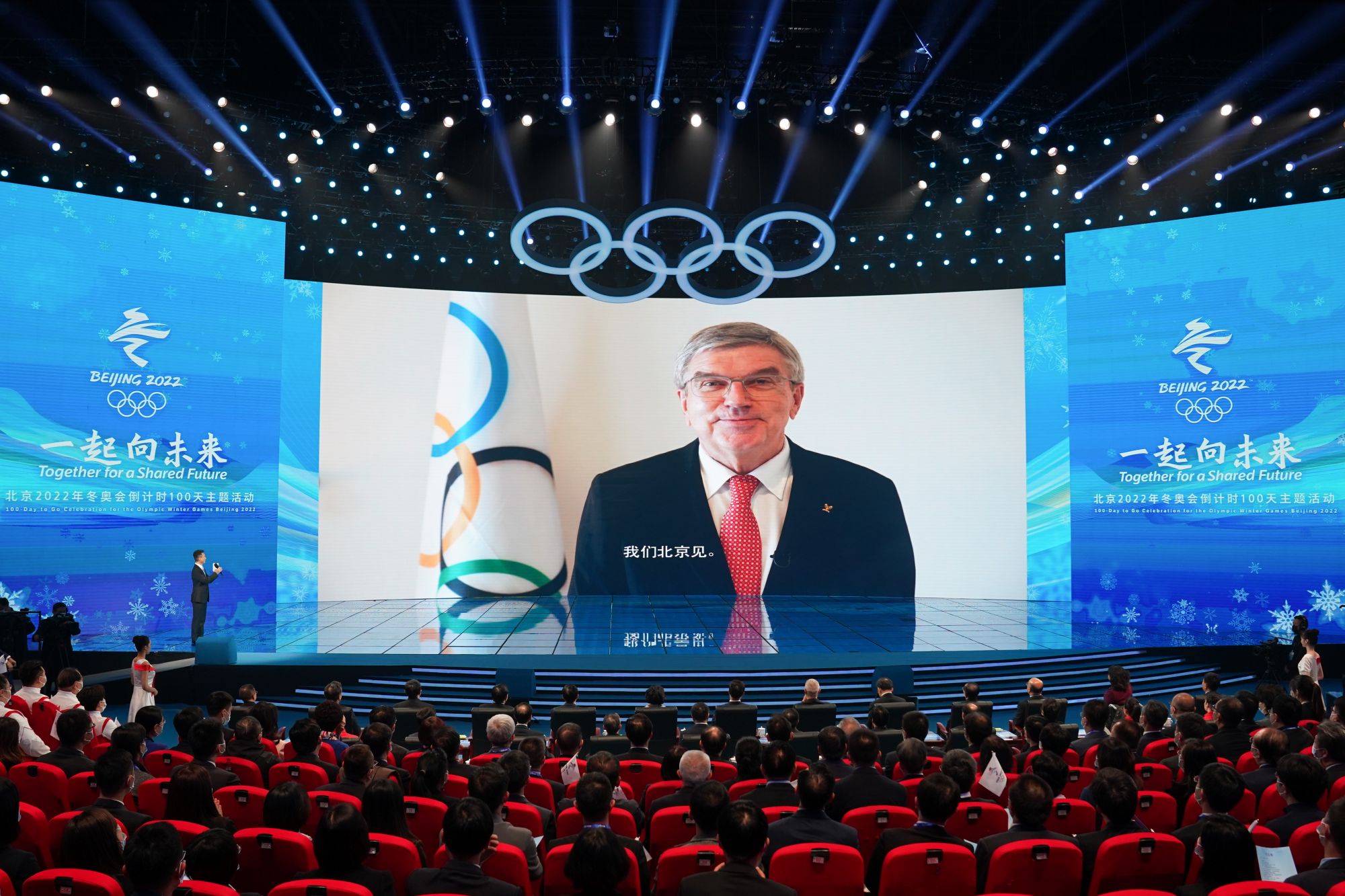 2021年10月25日,北京2022年冬奥会倒计时100天主题活动在北京举行,国际奥委会主席托马斯·巴赫通过视频连线致辞。新华社记者 鞠焕宗 摄