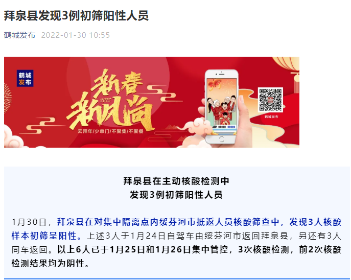 据鹤城发布微信公众号消息,1月30日,拜泉县在对集中隔离点内绥芬河市抵返人员核酸筛查中,发现3人核酸样本初筛呈阳性。上述3人于1月24日自驾车由绥芬河市返回拜泉县,另还有3人同车返回。以上6人已于1月25日和1月26日集中管控,3次核酸检测,前2次核酸检测结果均为阴性。