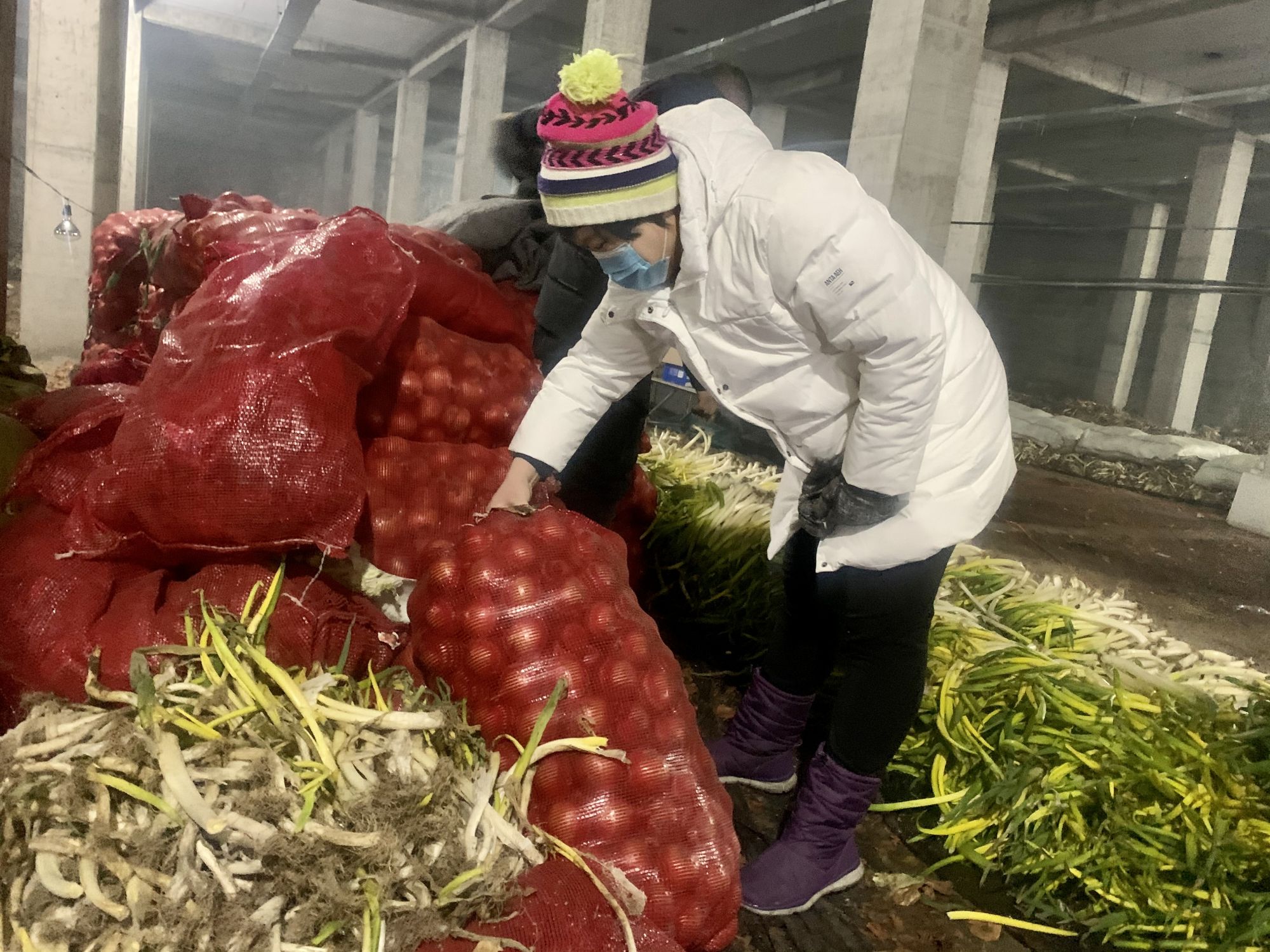 杨岚在元宝镇杨树村保鲜冷库里查看蔬菜。新华社记者 邹大鹏 摄