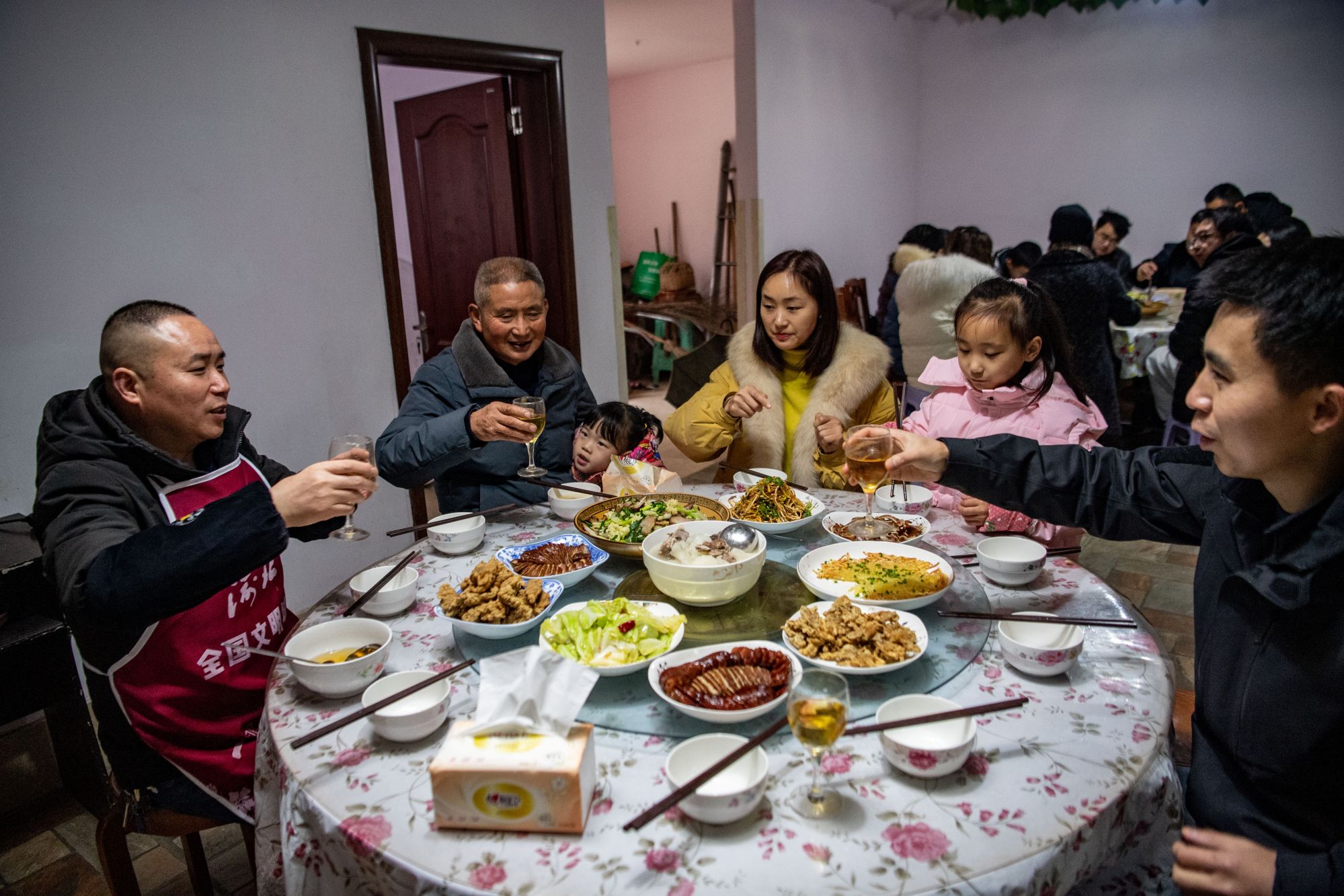 ↑杨建庆(左二)一家和亲友在家中吃饭(1月29日摄)。