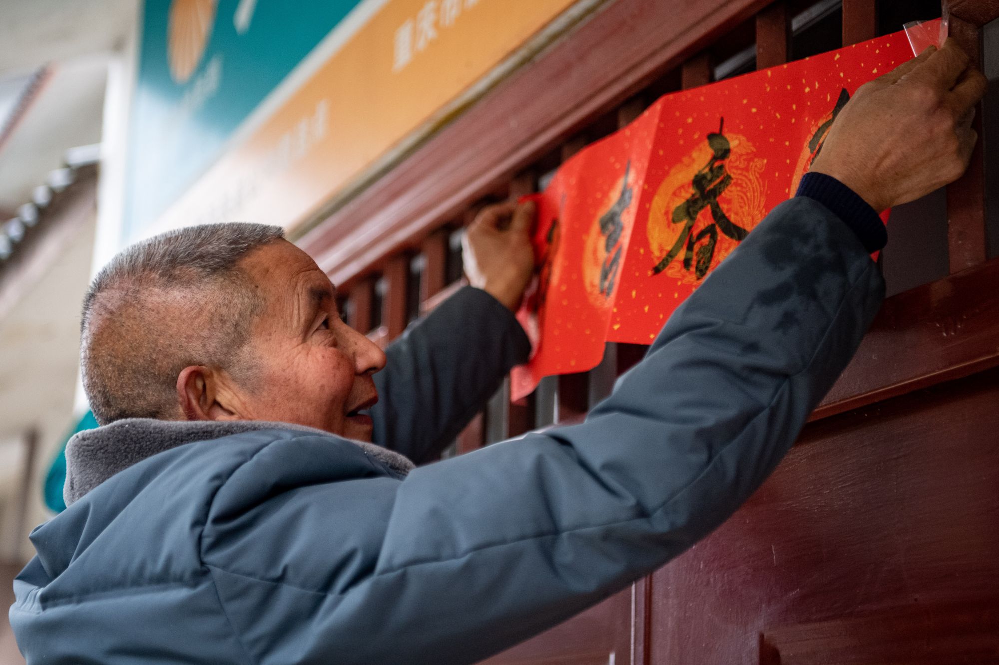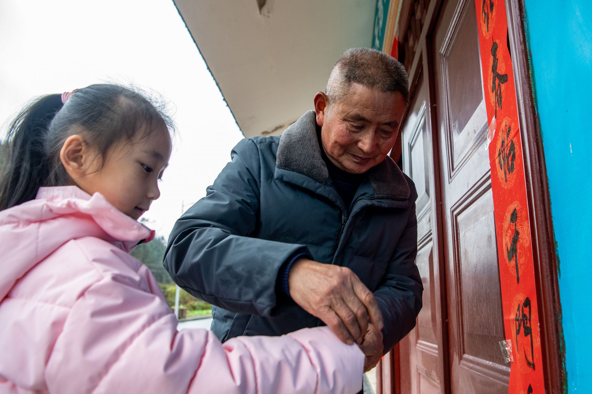 ↑杨建庆和外孙女在家里贴春联(1月29日摄)。