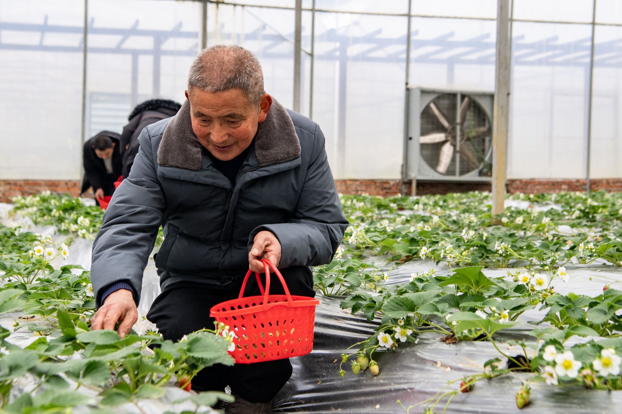 ↑杨建庆在大天池村的“桃韵天池”草莓基地种植大棚内采摘草莓(1月29日摄)。