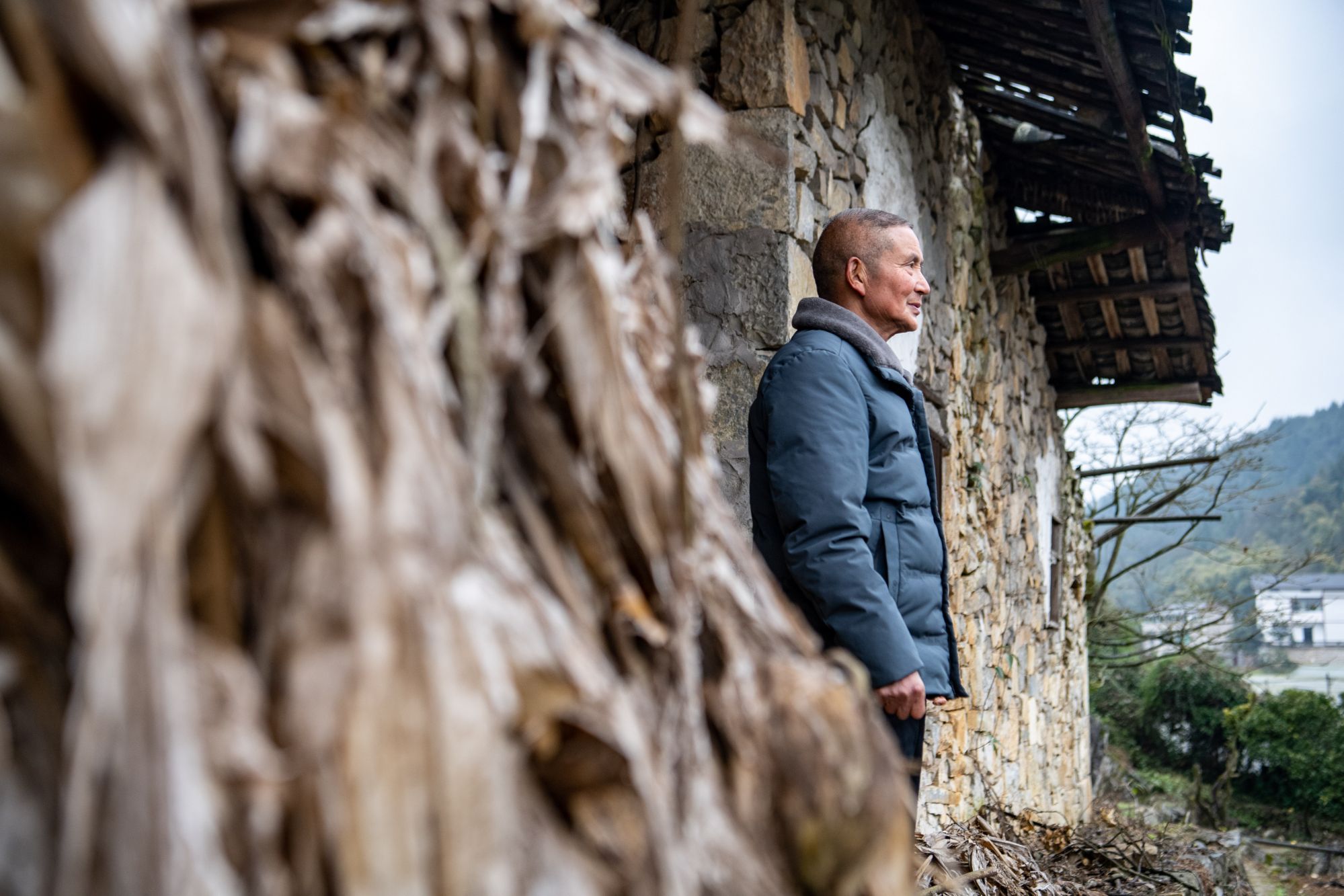 ↑杨建庆在老宅子前眺望新家的方向(1月29日摄)。