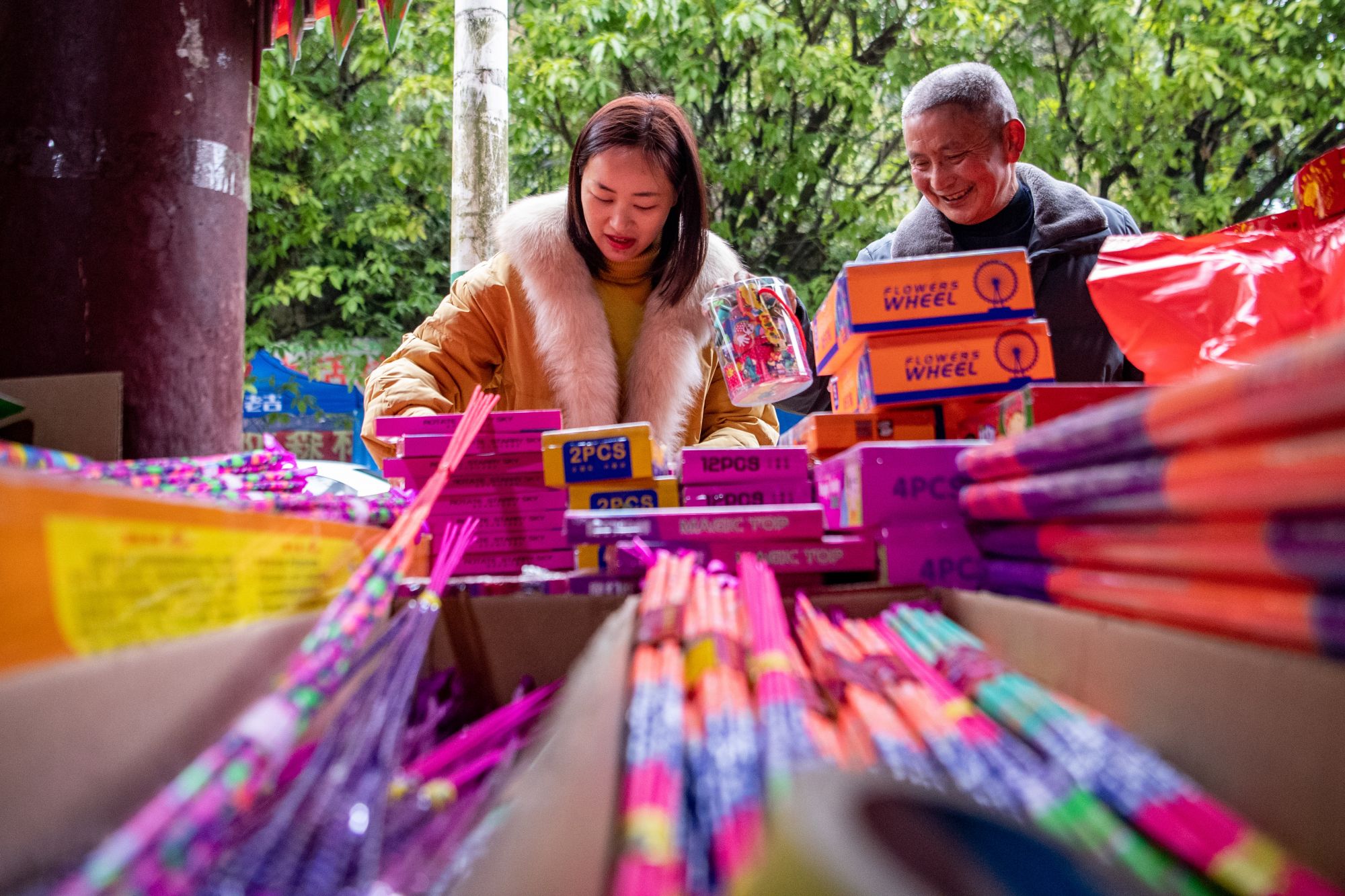 ↑杨建庆和女儿在农村年货市场上为外孙女购买玩具(1月29日摄)。